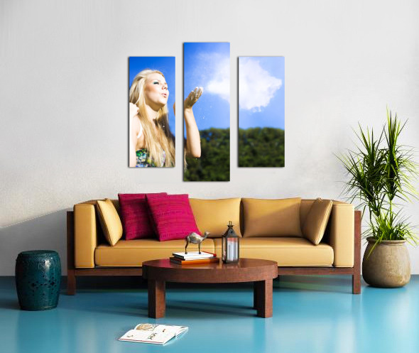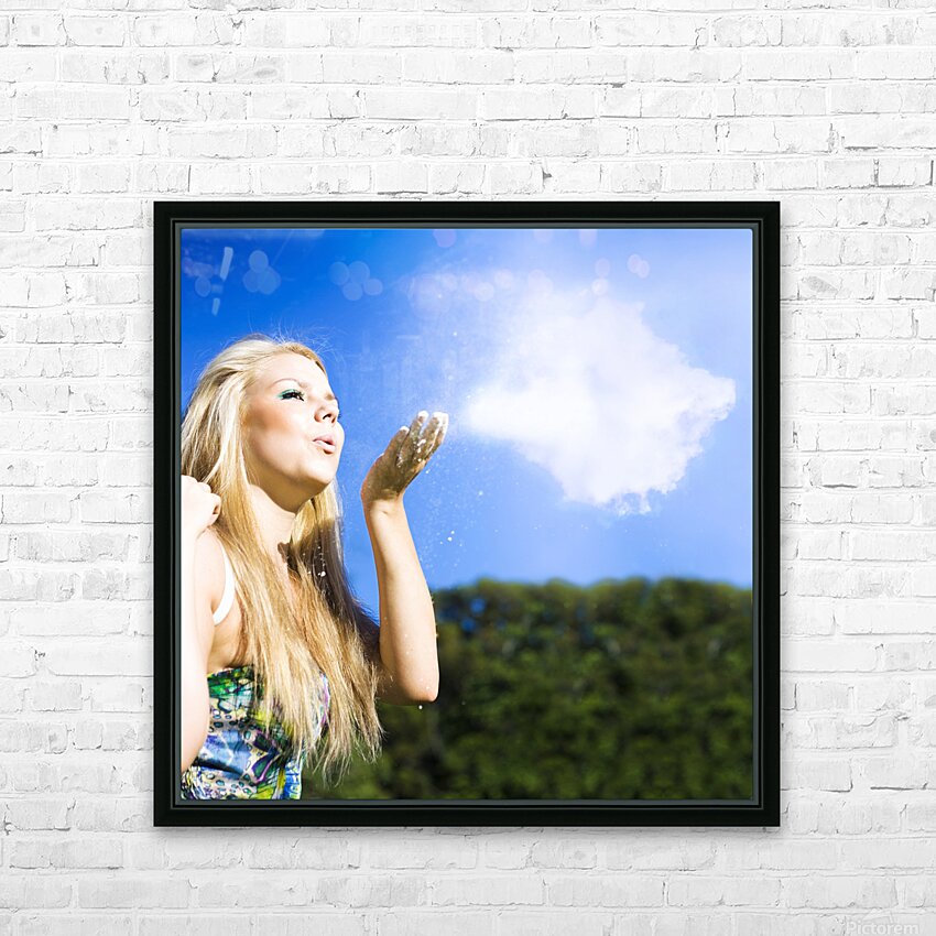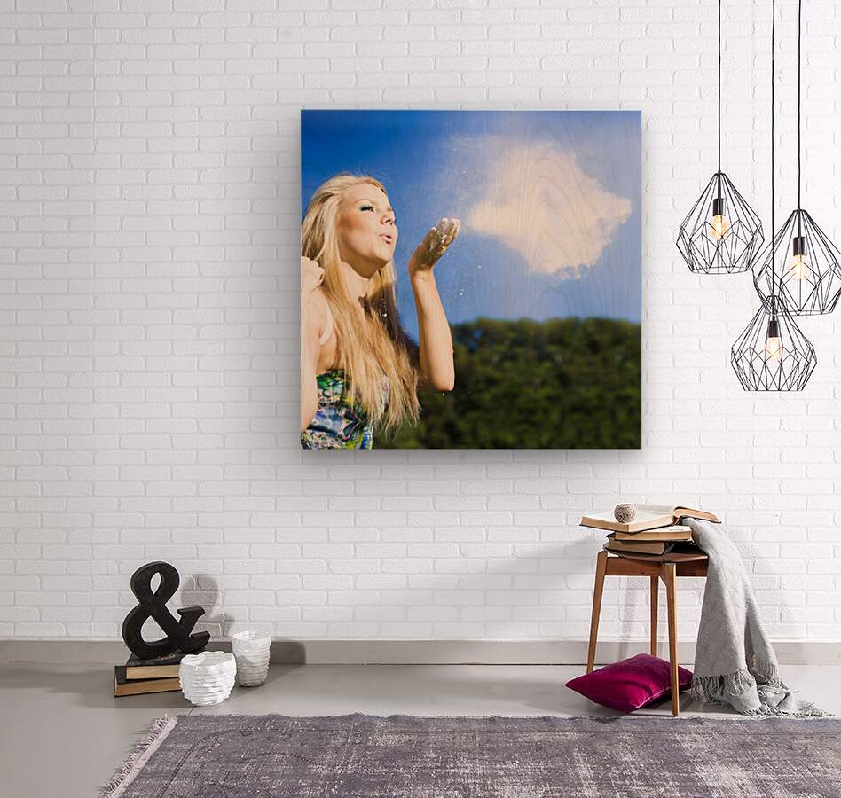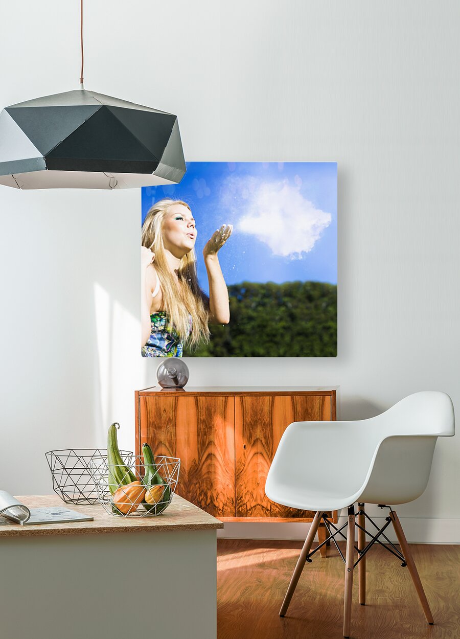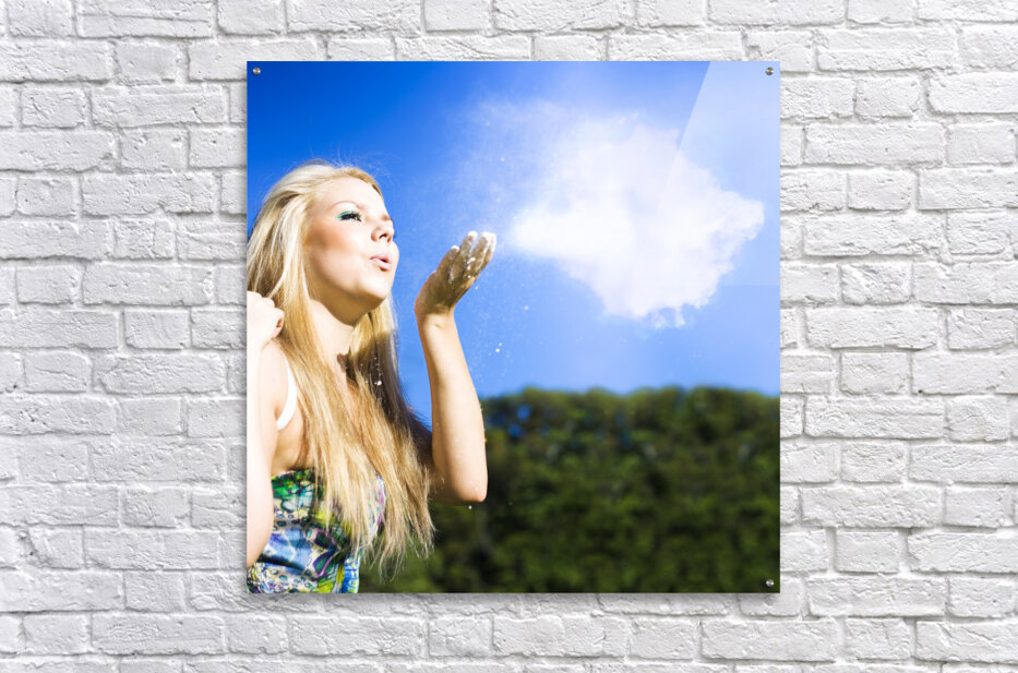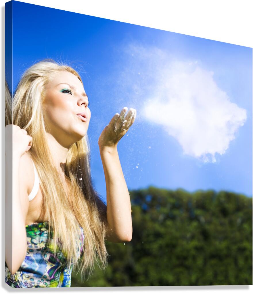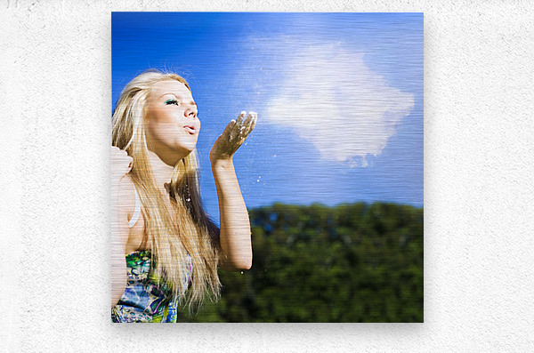 Cloud Creation With A Puff Of Magic a beautiful blonde girl gently blows a puff of white dust into the blue sky in a creation concept