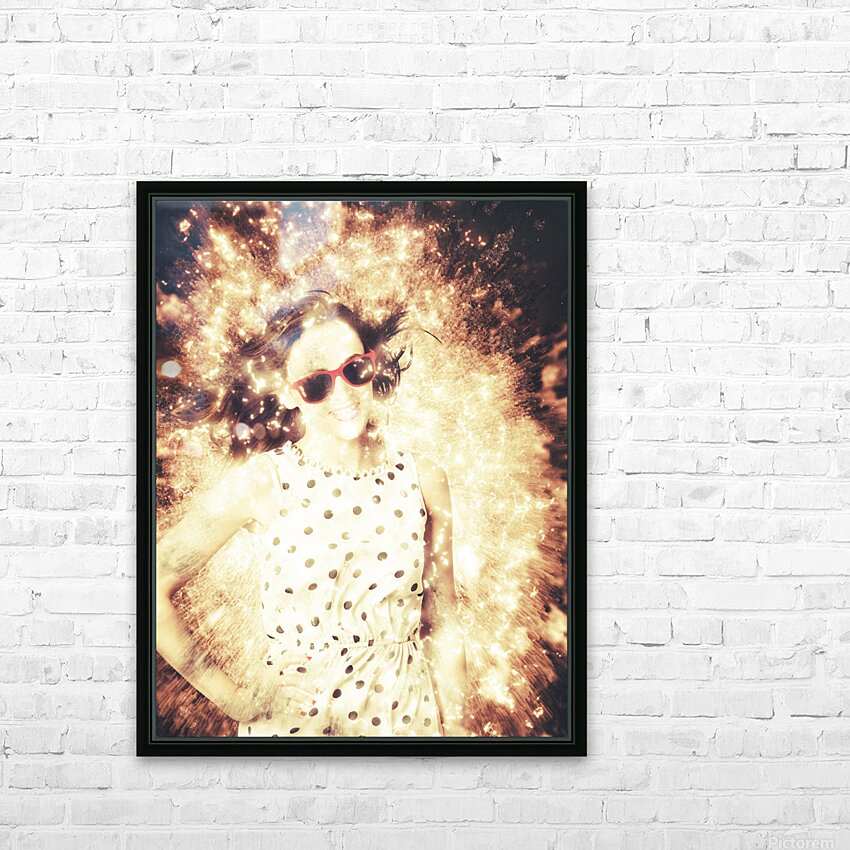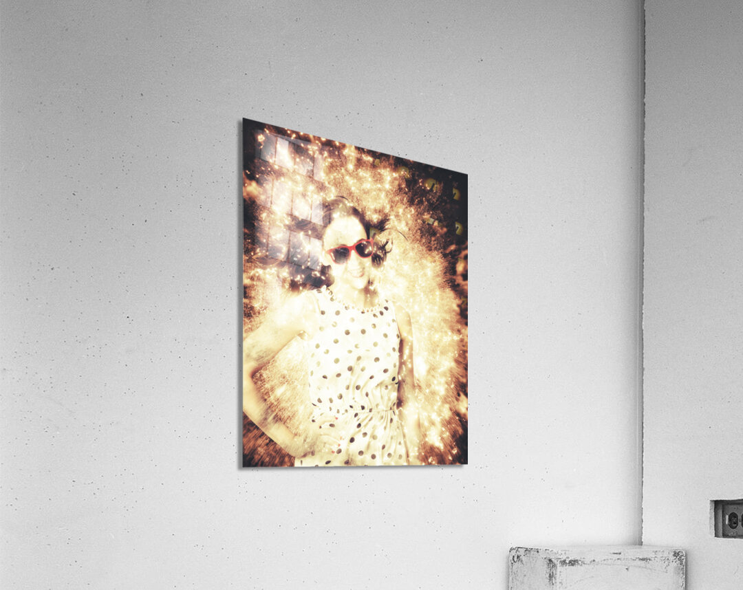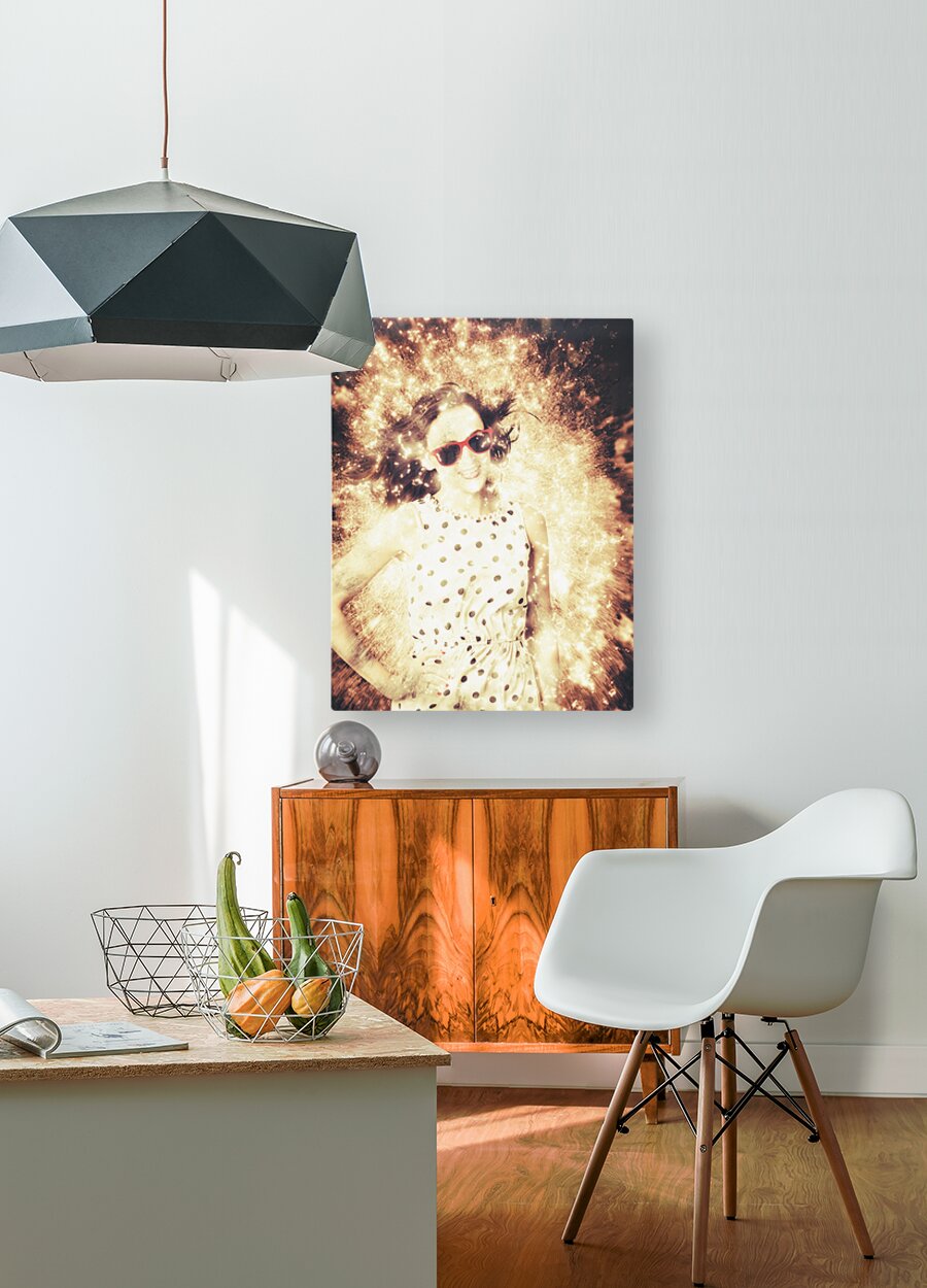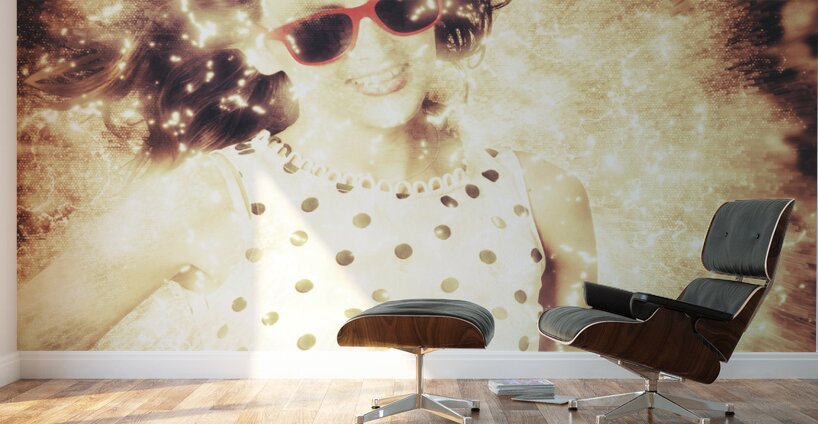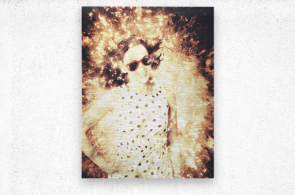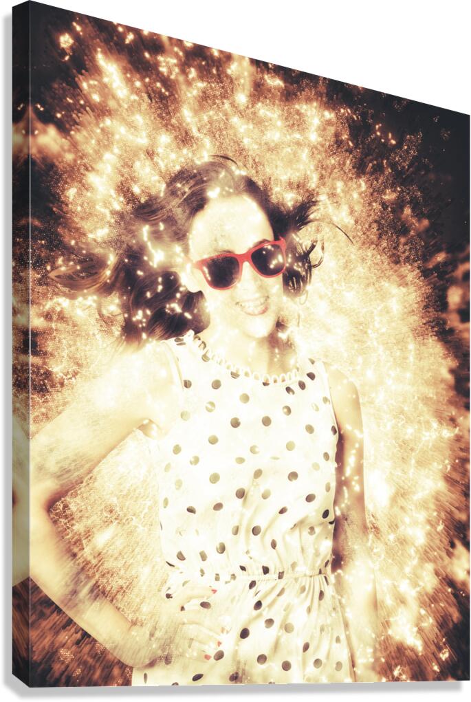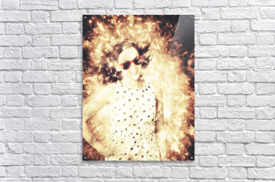 Creative digital artwork of a pinup woman in a bright and electric colourful light explosion. 1960s pinup bombshell