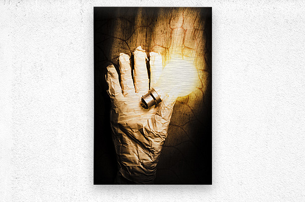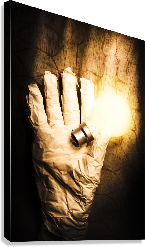 Halloween ideas concept with a shining light bulb in a crinkled mummy hand over textured wood