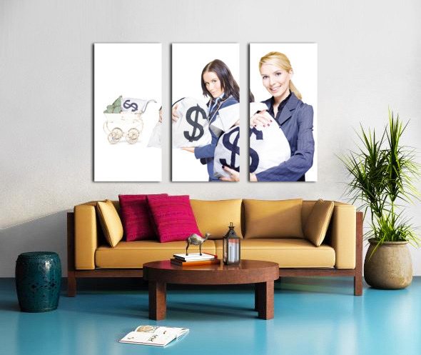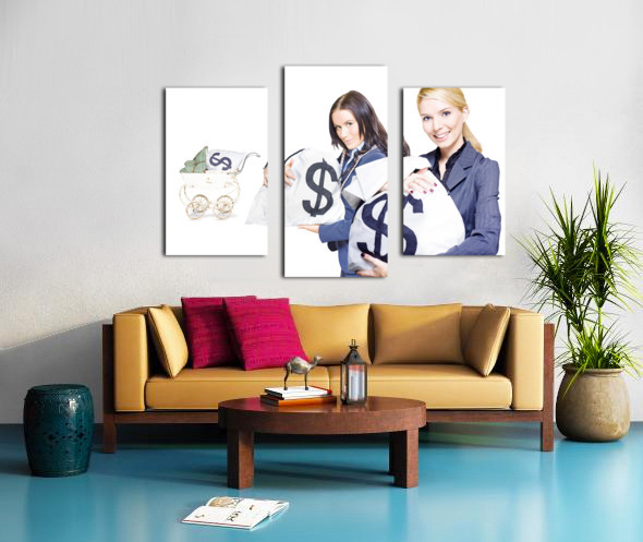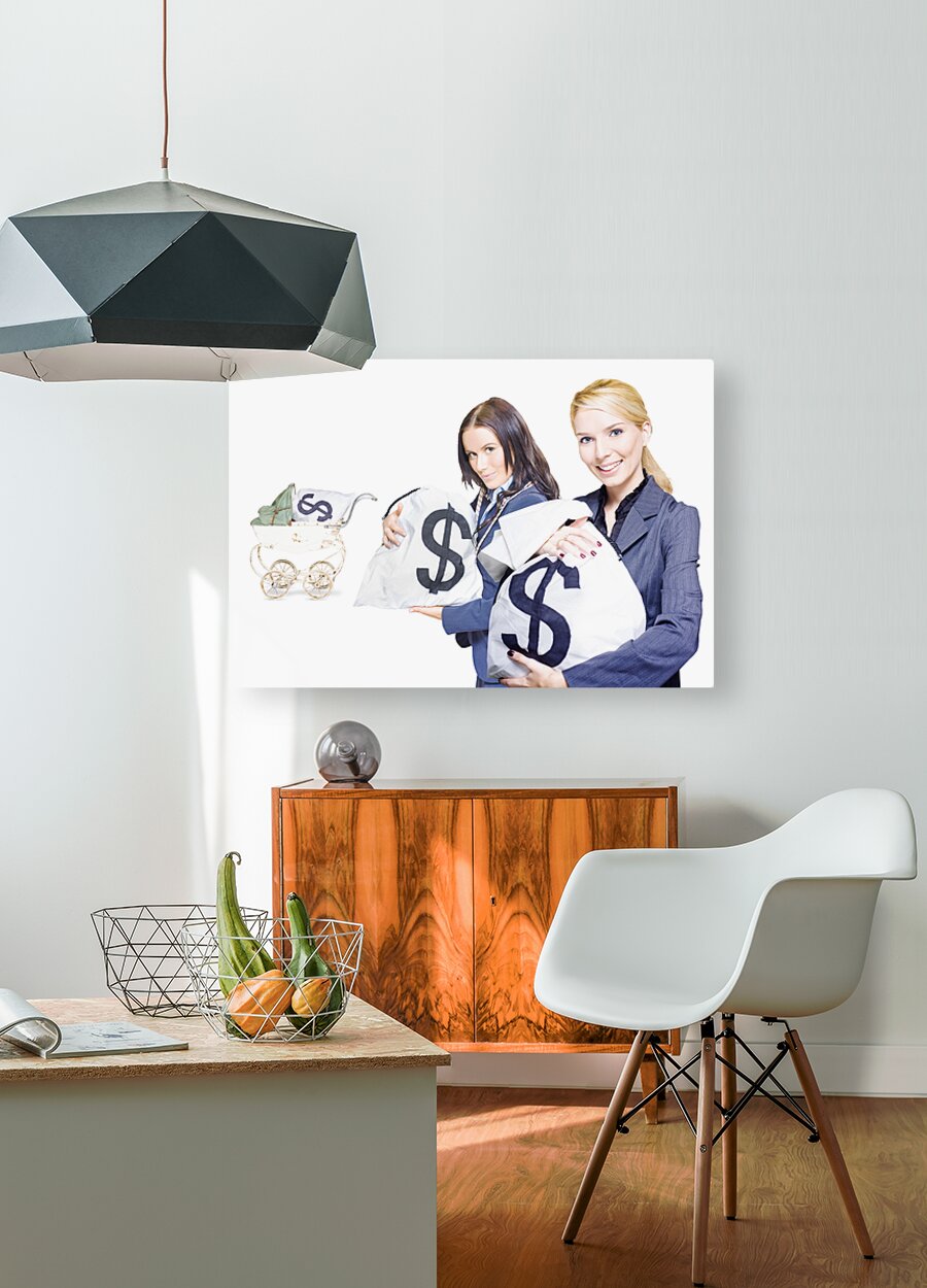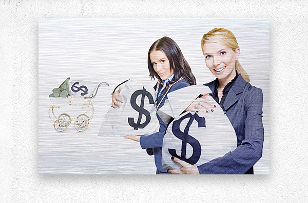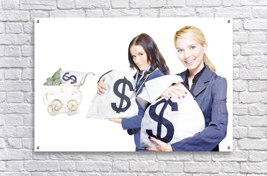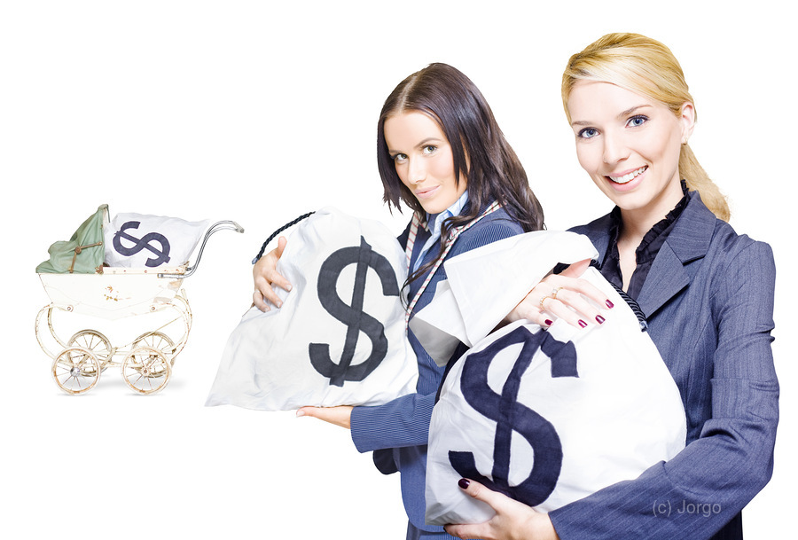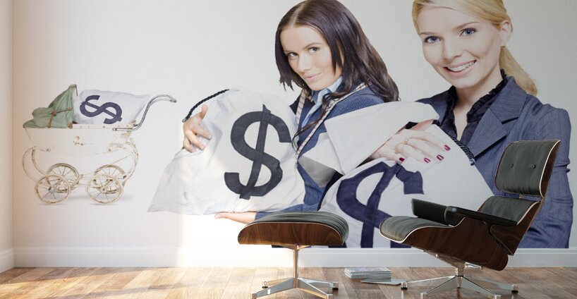 Wealthy young business women holding money bags with a baby pram in background to represent investment nurturing financial planning and business development