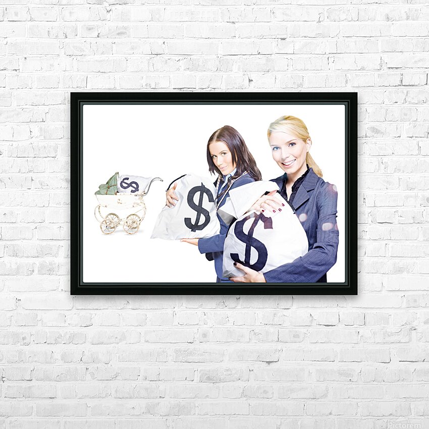 Wealthy young business women holding money bags with a baby pram in background to represent investment nurturing financial planning and business devel...[+]