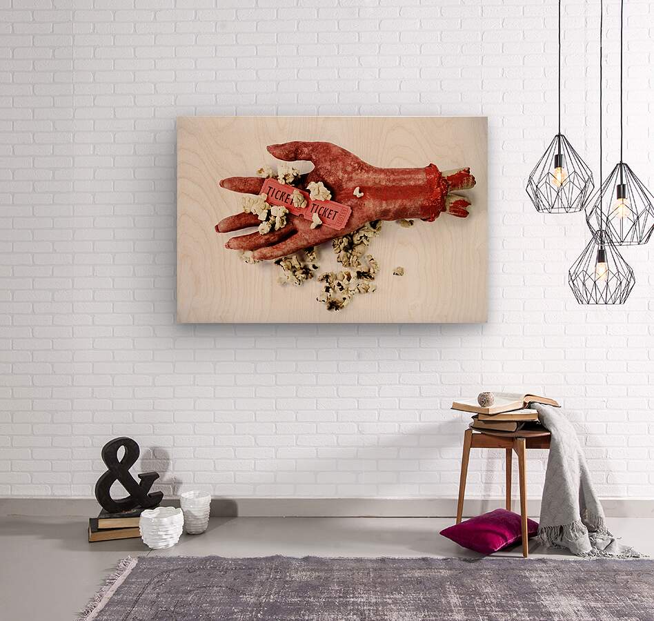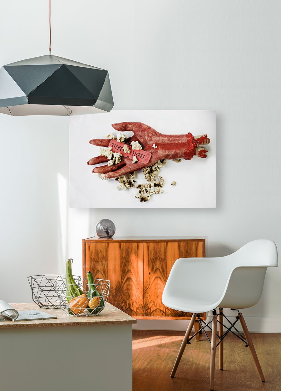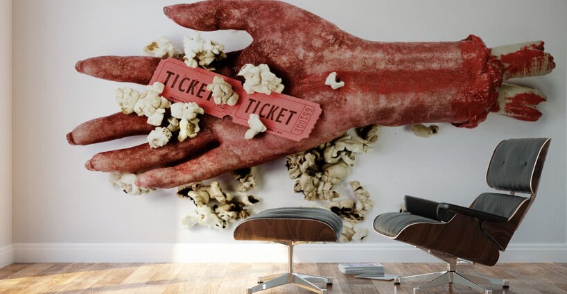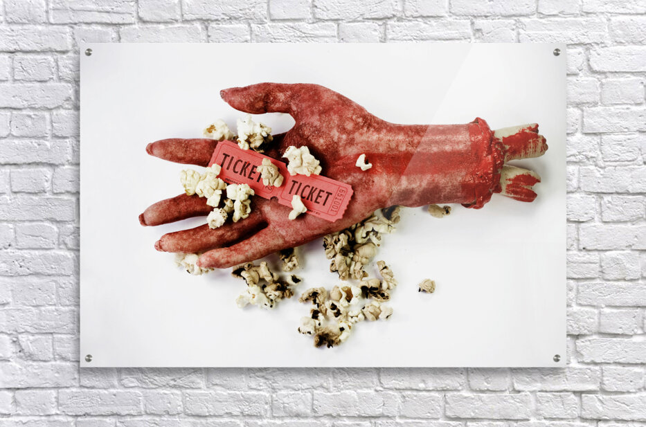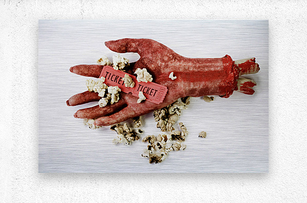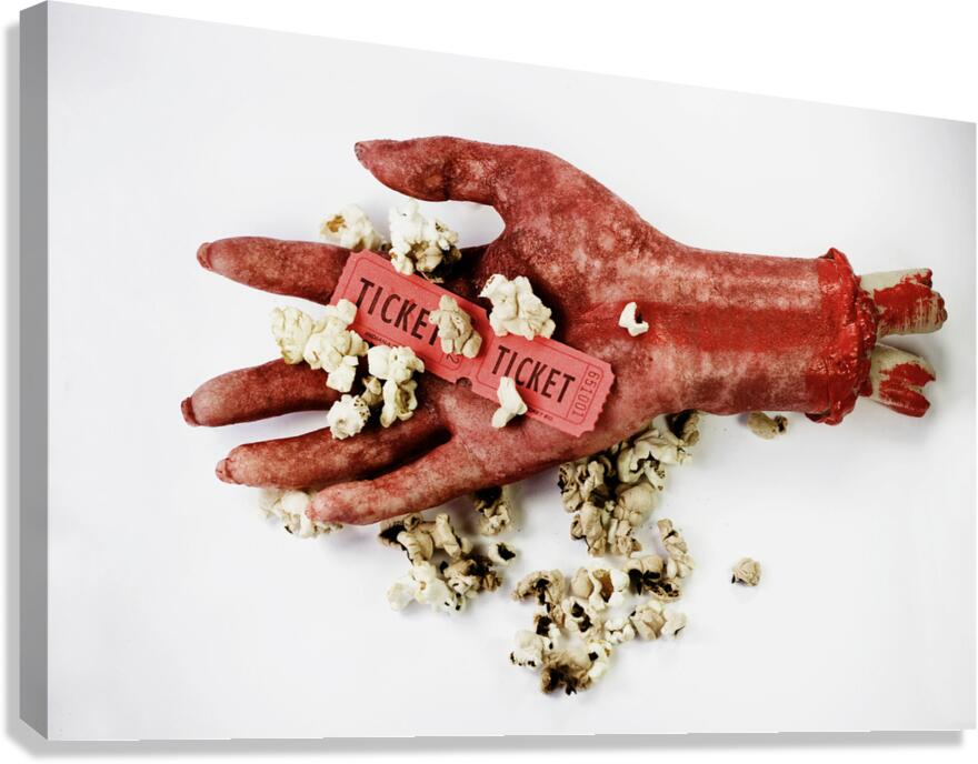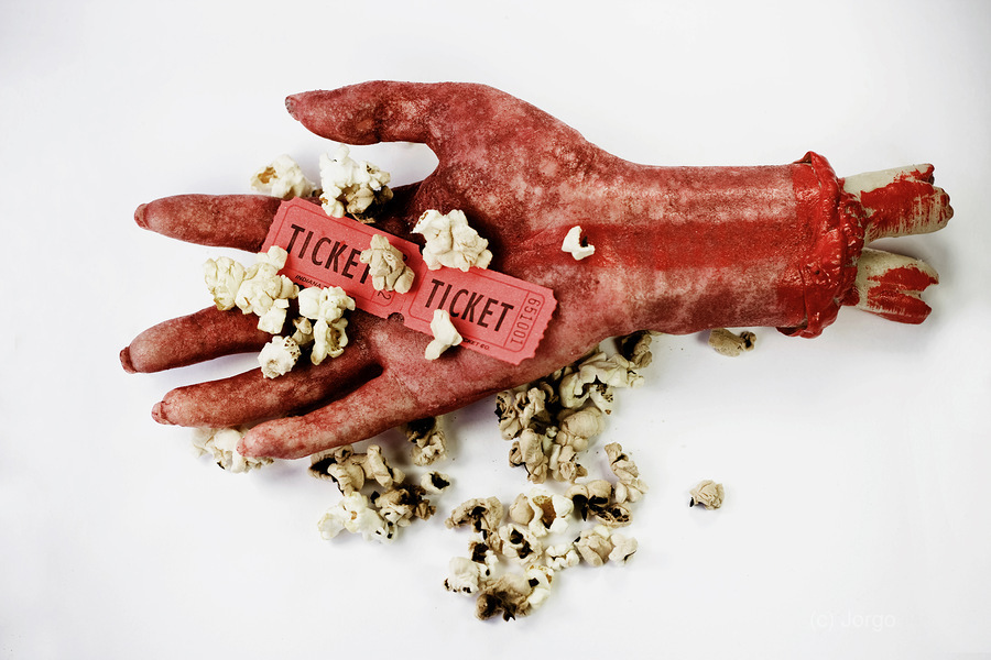Scary Image Of A Bloodied Dismembered Hand Holding Popcorn And Tickets To The Movies In A B-Grade Horror Film Review Concept