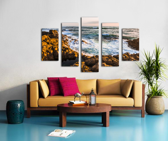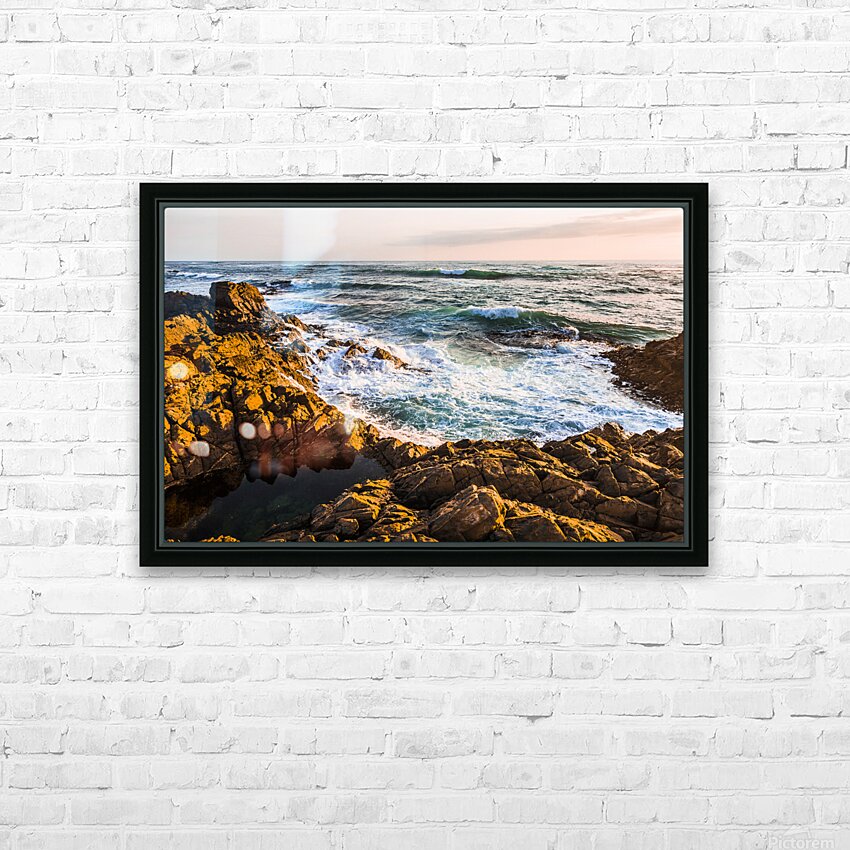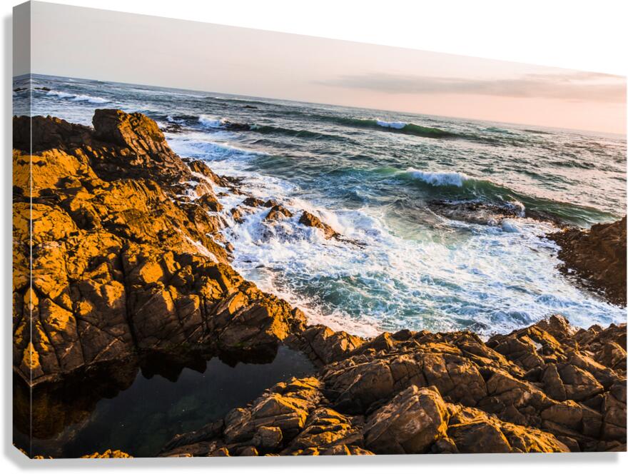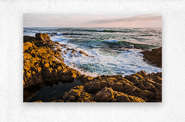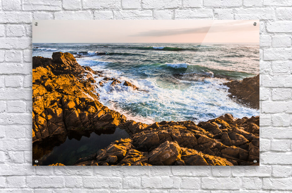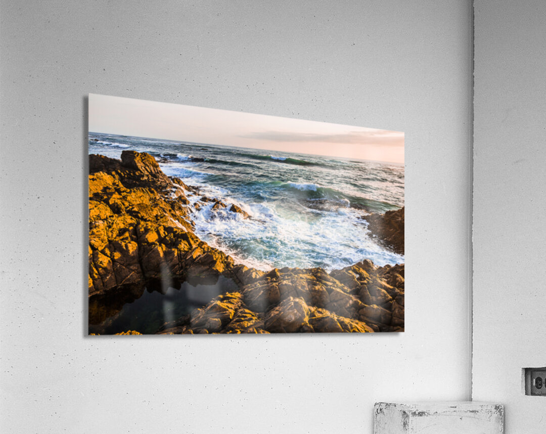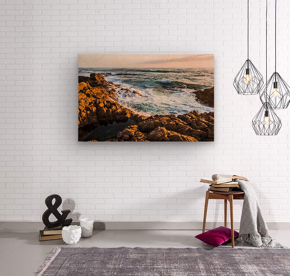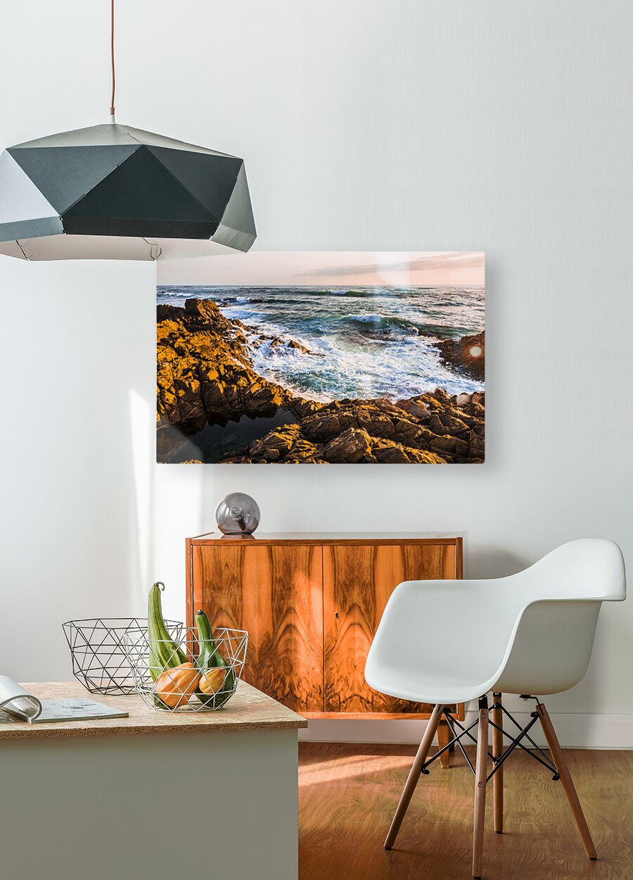 Colourful contrasted sea view on a splash of tranquil surf in the late light of dusk. Granville Harbour Western Tasmania Australia