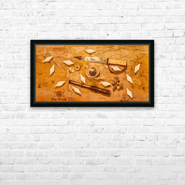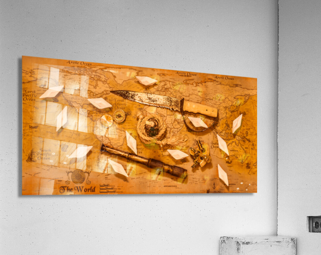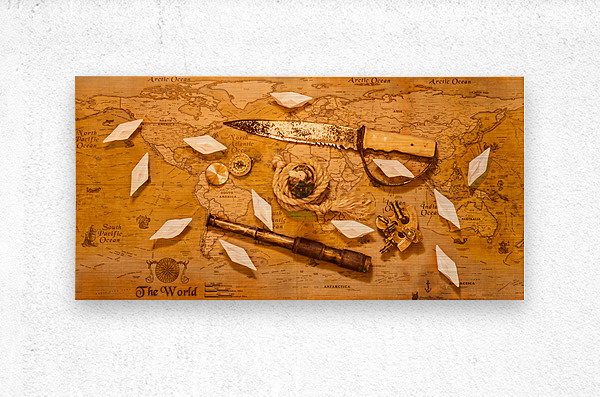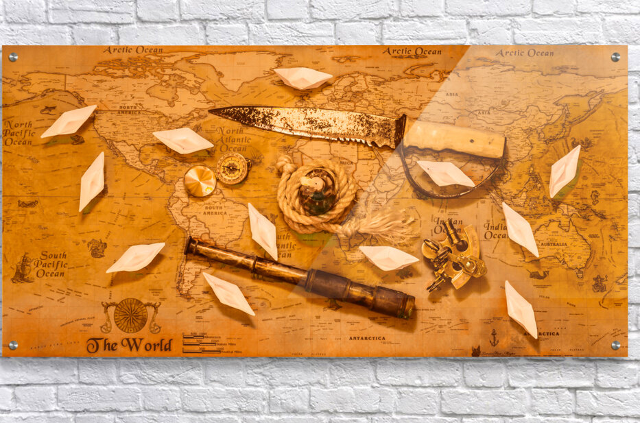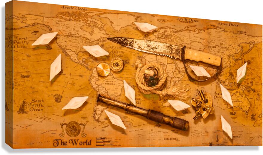 Panoramic artwork on a coursing display of seafarer antiquities with paper boats navigation apparatus and maritime mapping