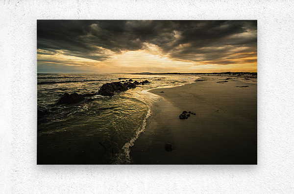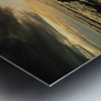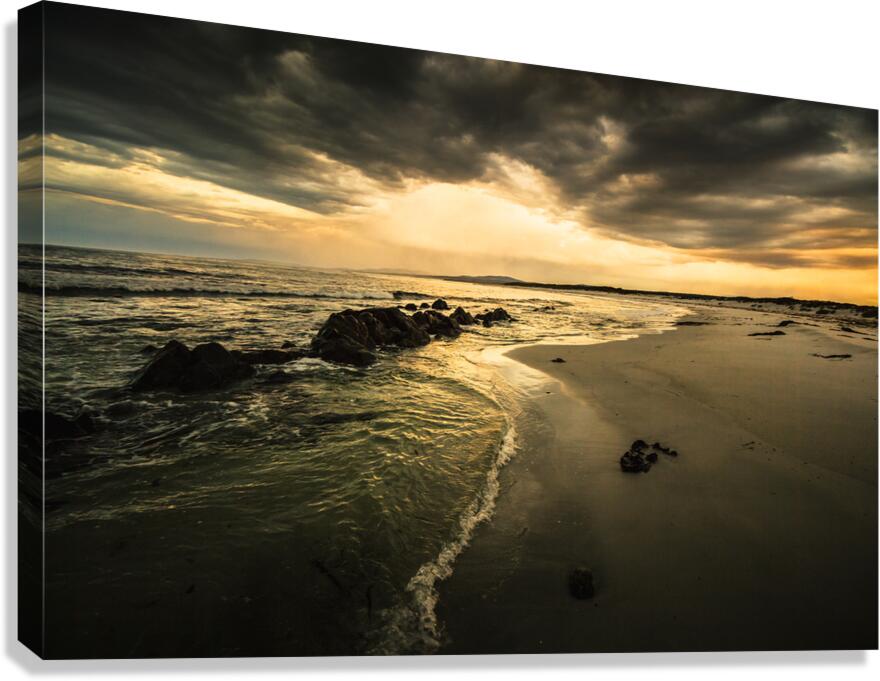 Contrasted ocean landscape on the first lights of dawn breaking through dark clouds. Policemans Point East Coast Tasmania Australia