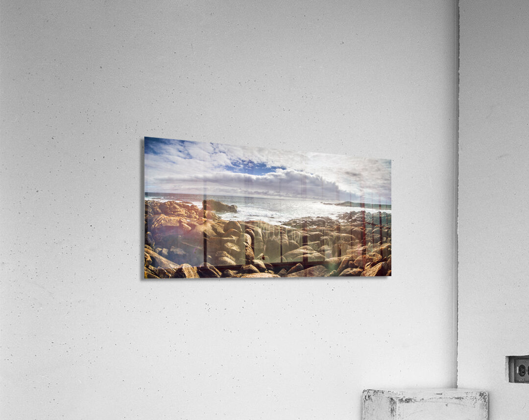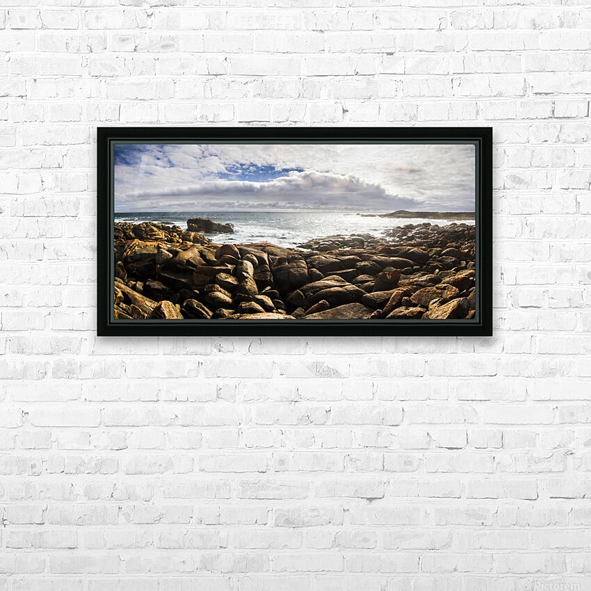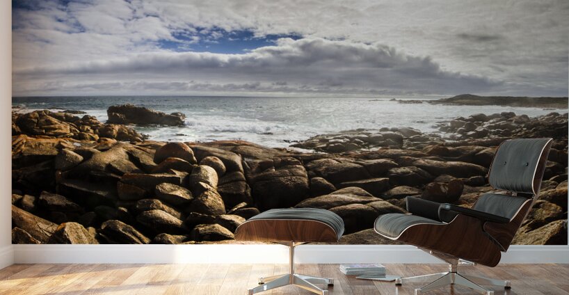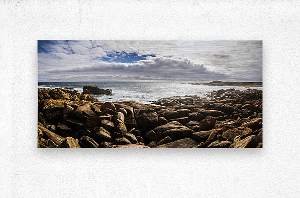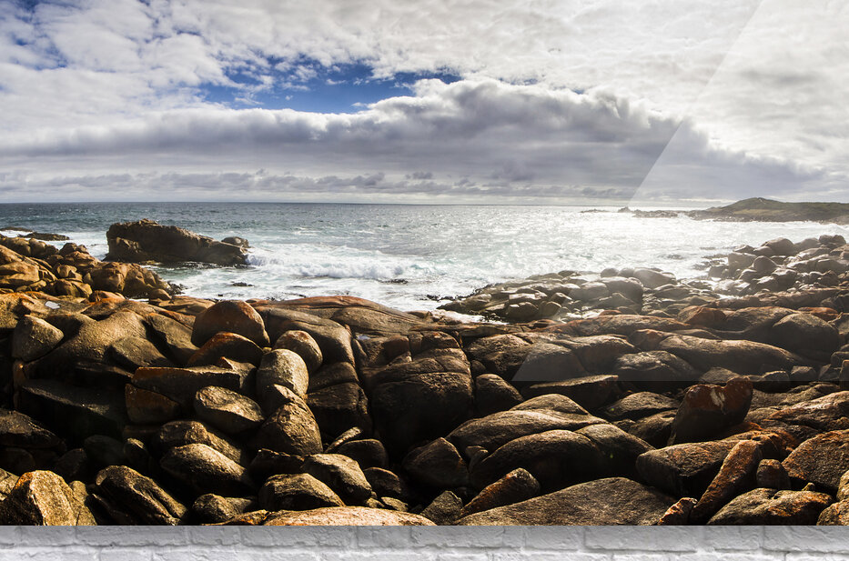 Oceanic panoramic background on a boulder covered Tasmania seaside in sunlit conditions. Taken Granville Harbour Tasmania Australia