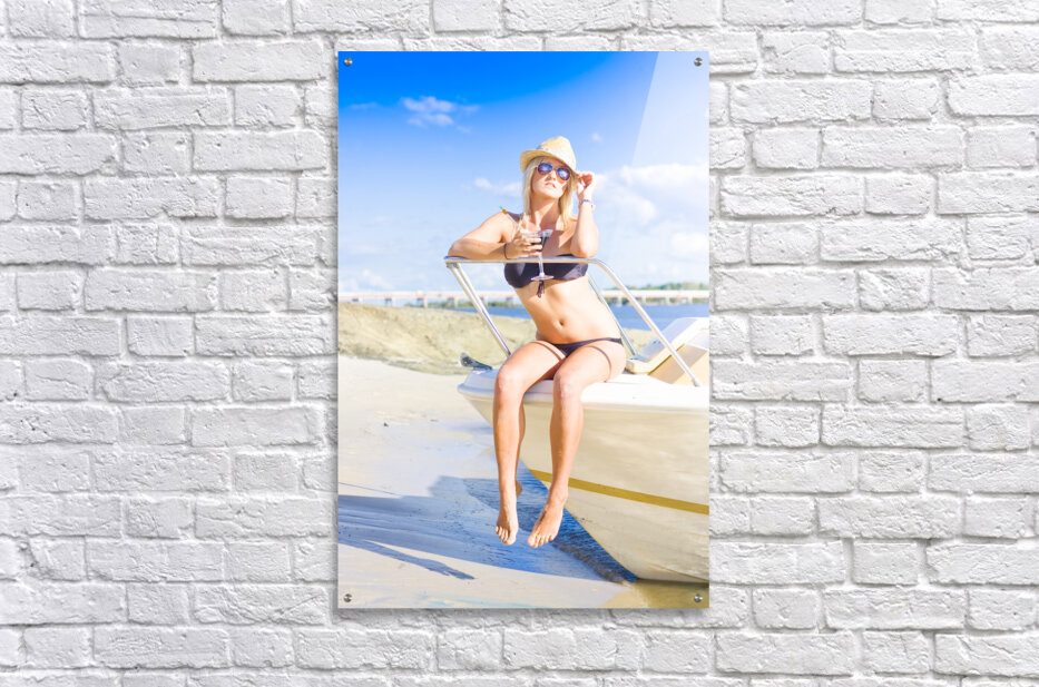 Stunning Babe Wearing Bikini Sipping On A Martini Cocktail Drink While Sitting On A Speedboat At A Tropical Island Travel Destination Of Pleasure And Fun
