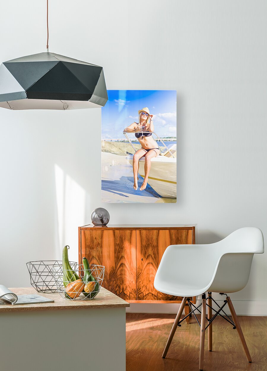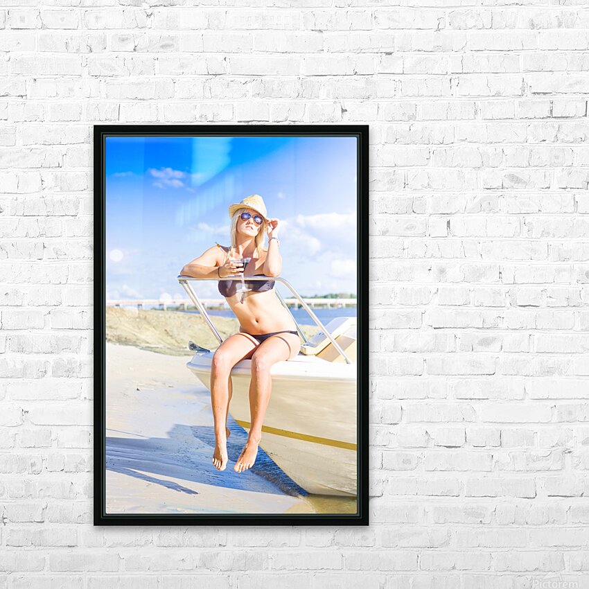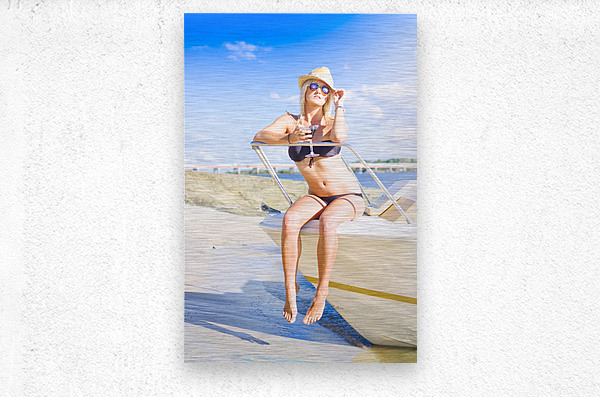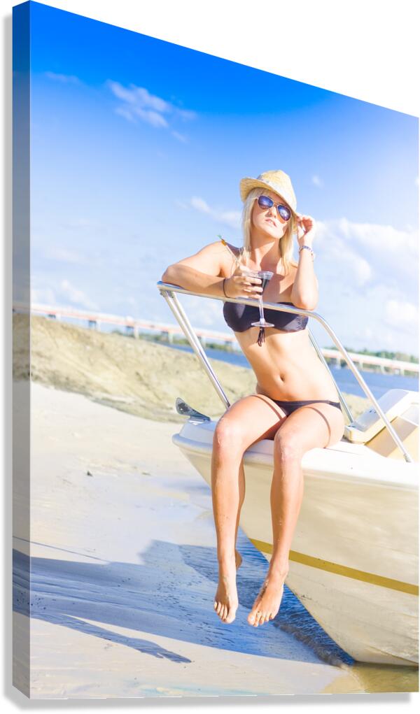 Stunning Babe Wearing Bikini Sipping On A Martini Cocktail Drink While Sitting On A Speedboat At A Tropical Island Travel Destination Of Pleasure And ...[+]