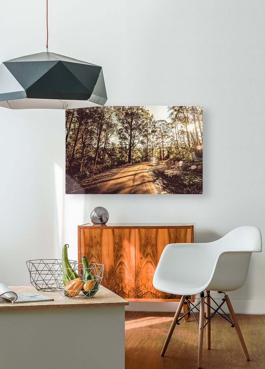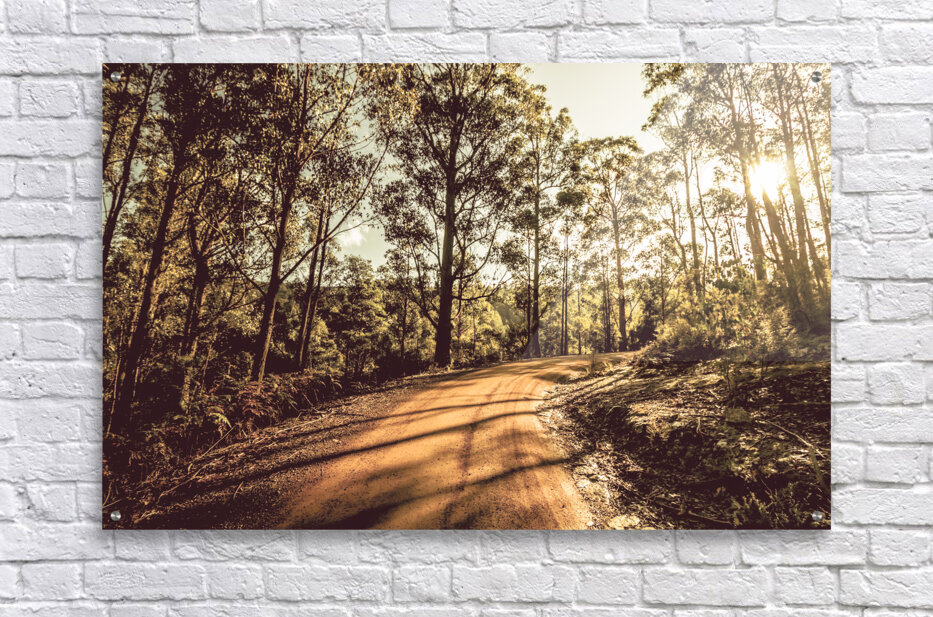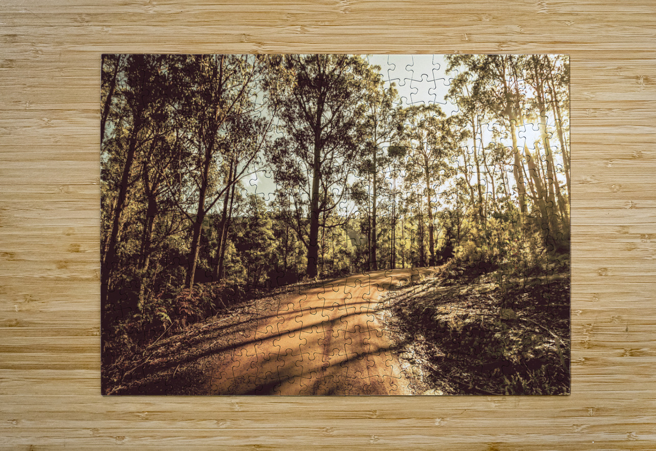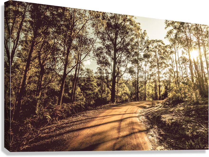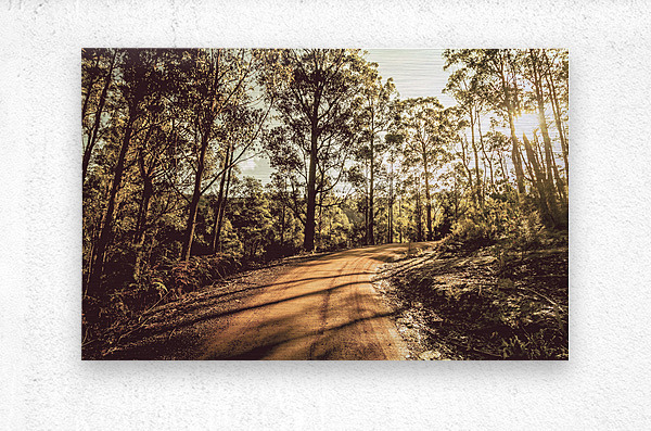 Horizontal outdoor background of a scenic dirt road curving around a forest bend. Off road trails Judbury Tasmania Australia