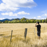MAN ENJOYING A RURAL FARM LANDSCAPE IN HOBART