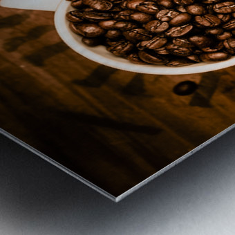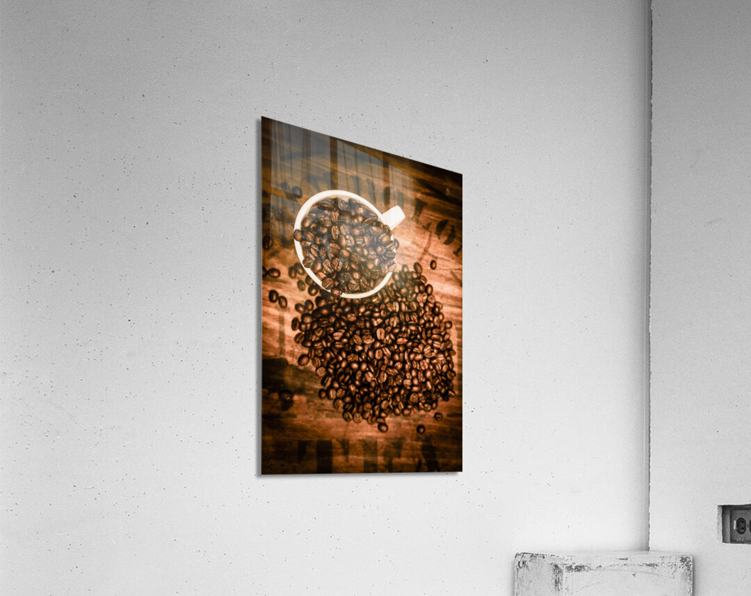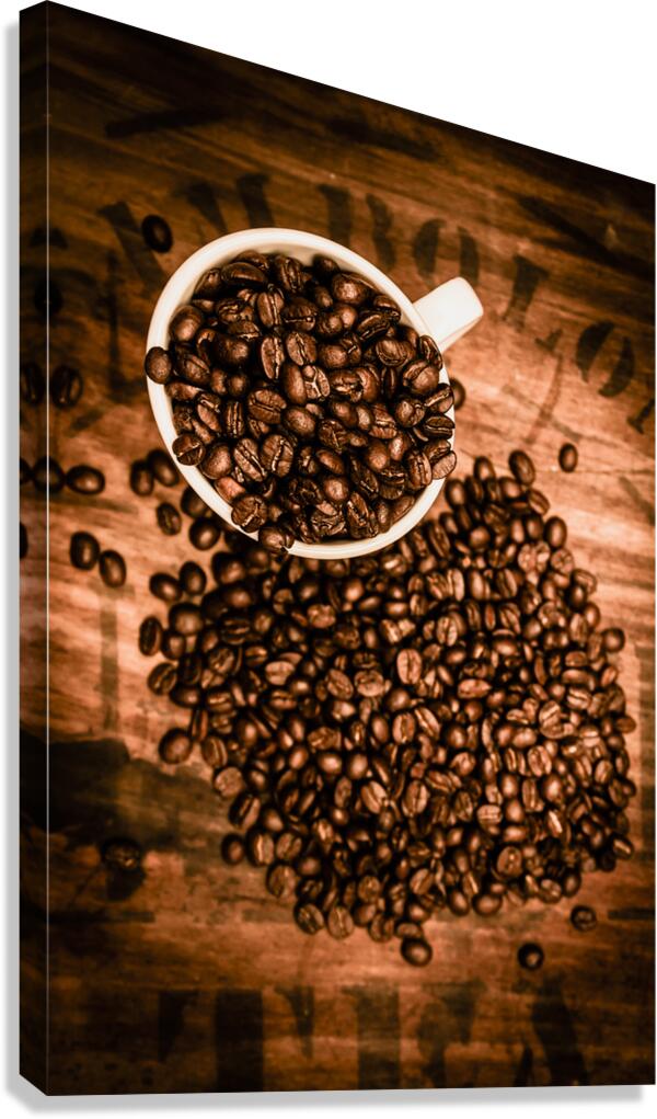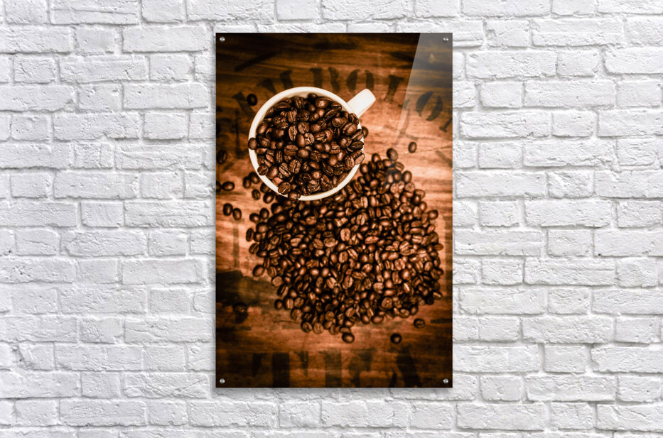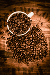 Top down rustic cafe artwork with a mug of organic brown coffee beans on vintage tea crate. Brewhouse stills