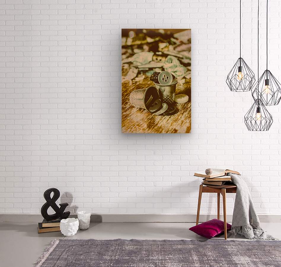 Pail nostalgic object photography on thimbles holding old fashion buttons. Retro craft buckets
