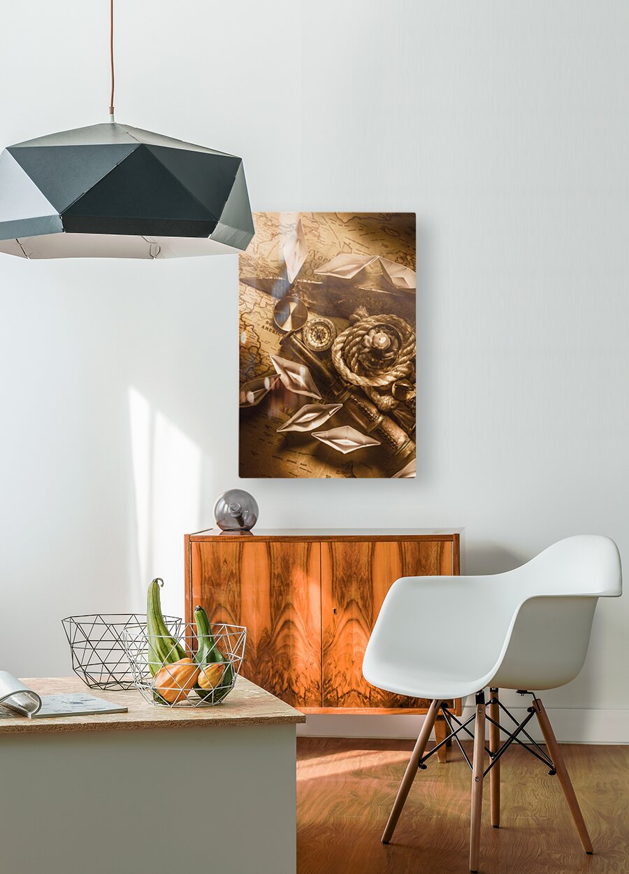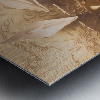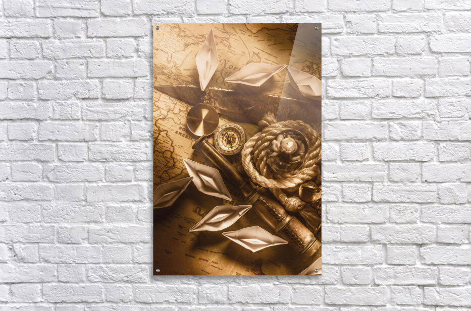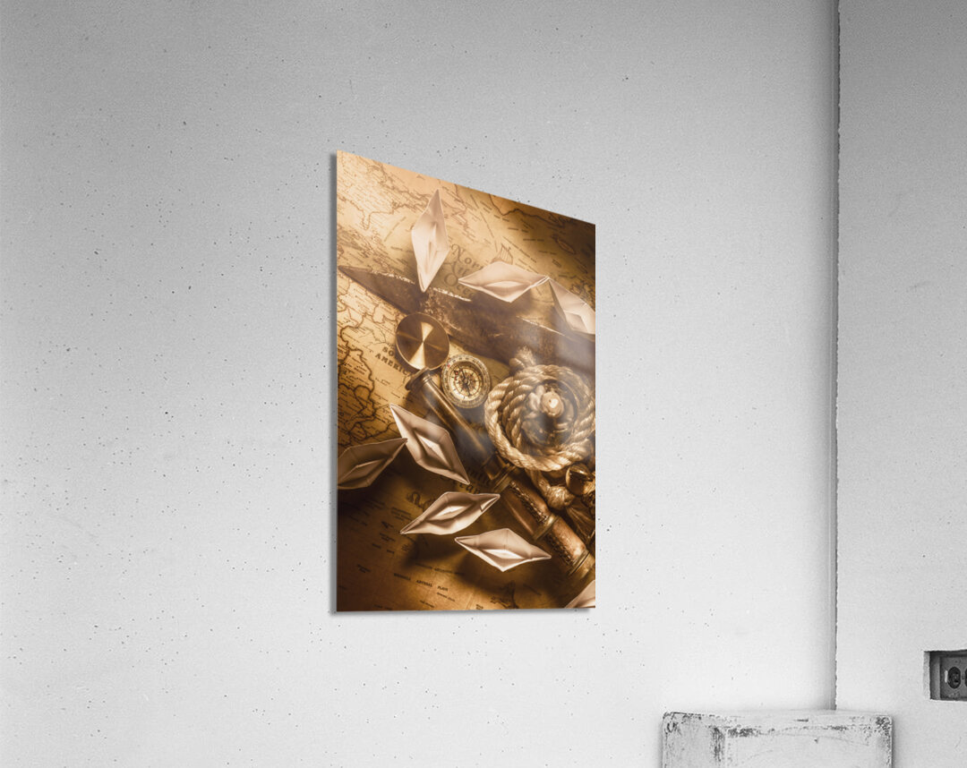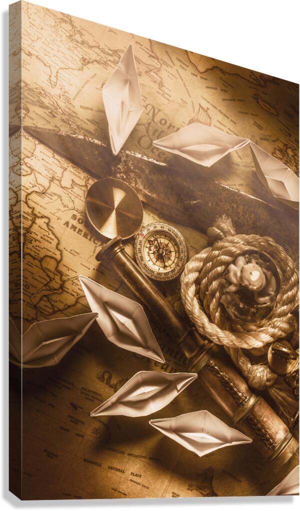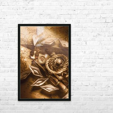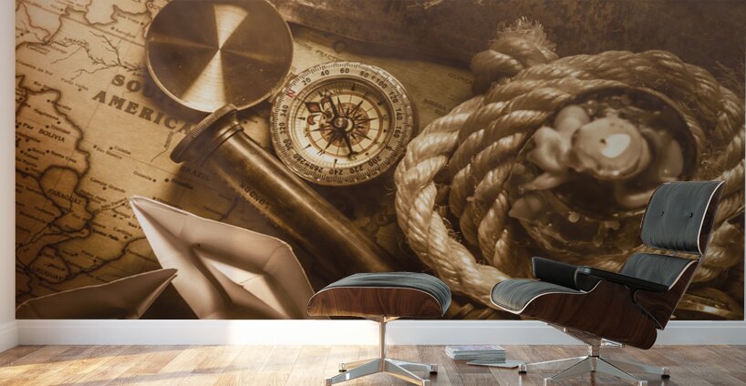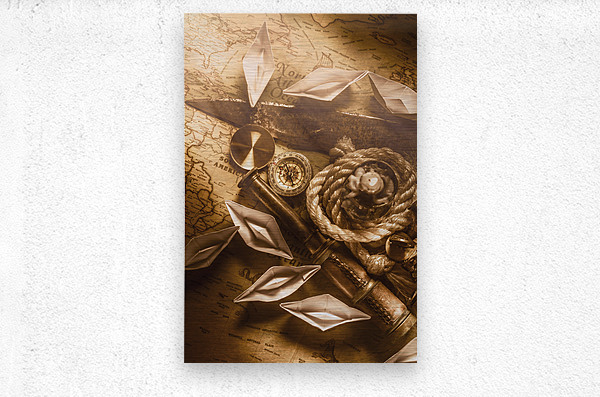 Rustic scene in ocean expedition with vintage navigational tools and the sealights of ocean trade