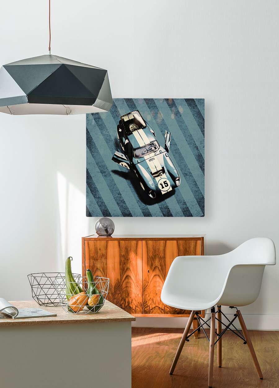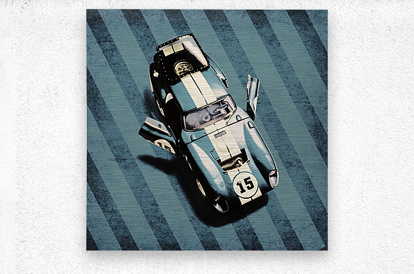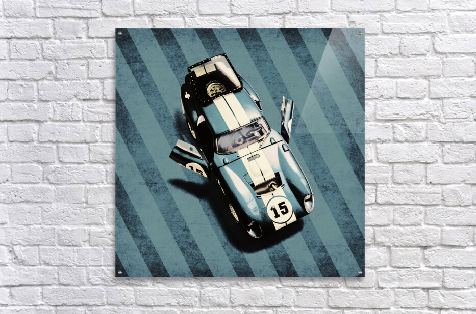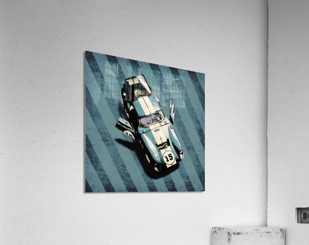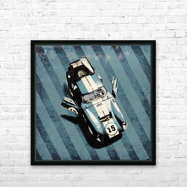 Sports car scene of striped racing nostalgia with a 1965 Shelby Cobra Daytona in racing blue