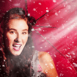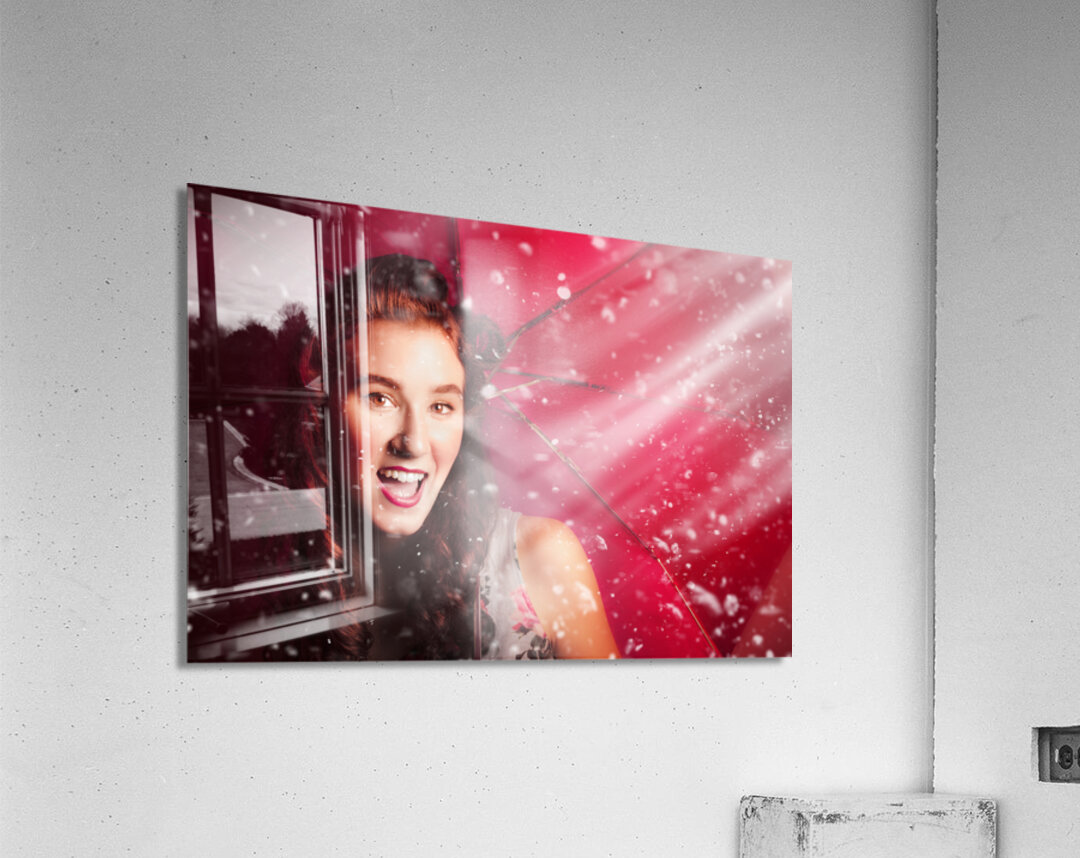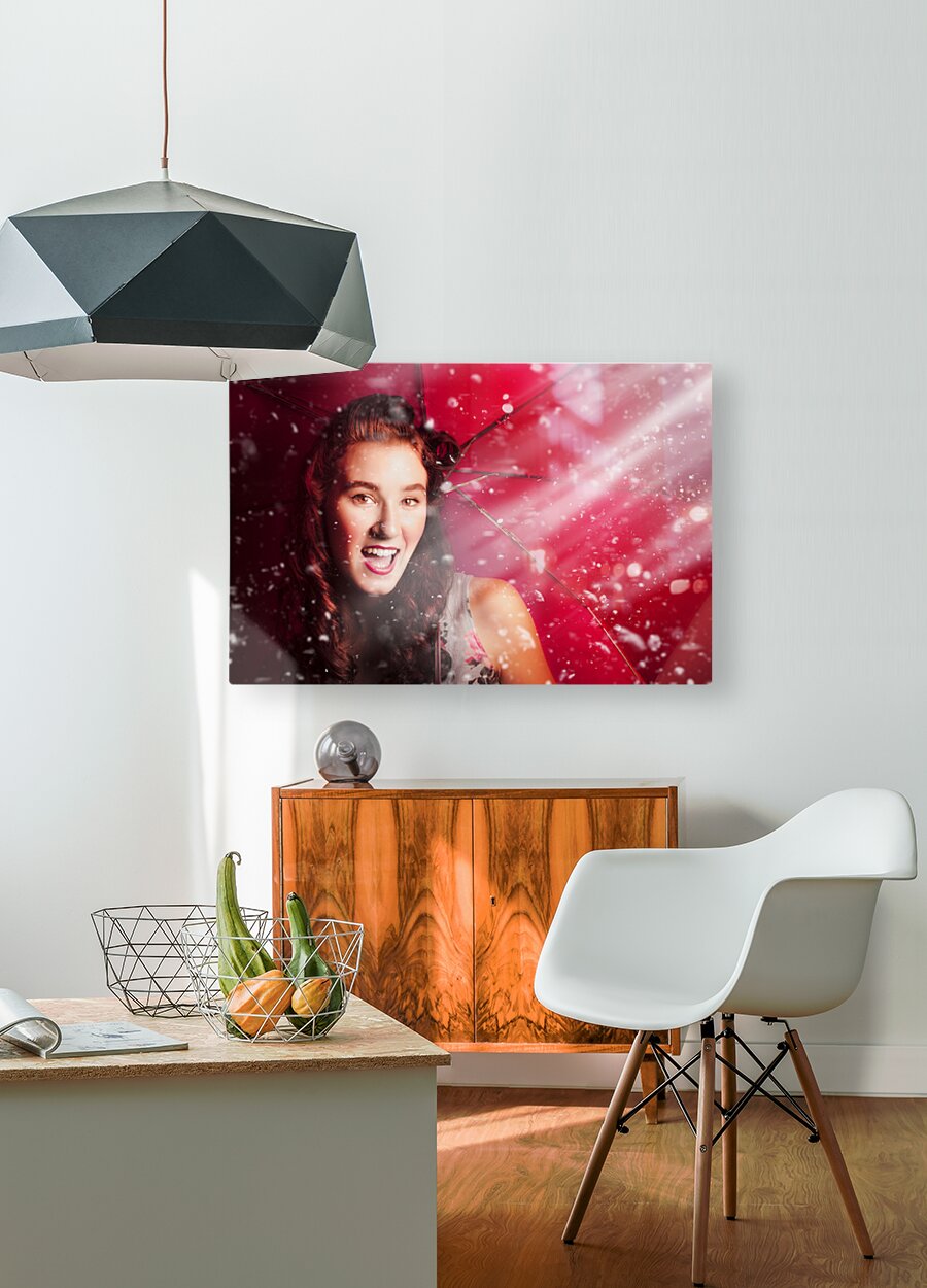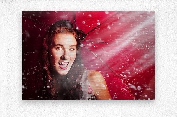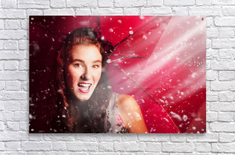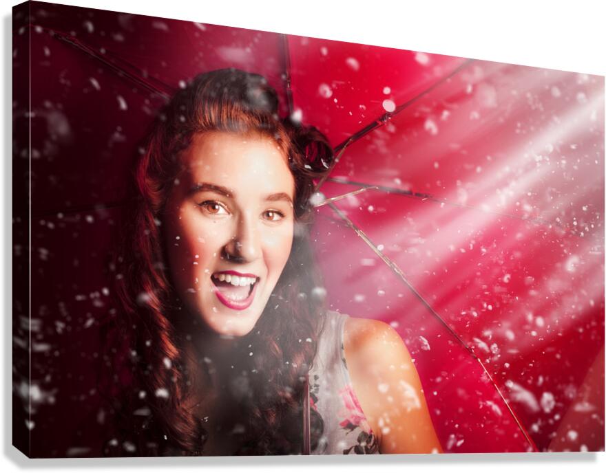 Happy playful girl smiling underneath droplets of falling rain with red umbrella. Fifties summer fun pin up