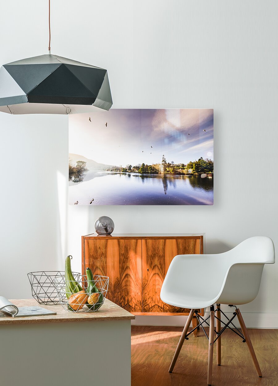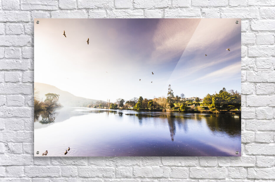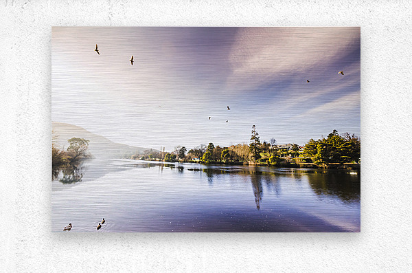 Vibrant landscape photo of a pastel tone lake with distant reflections of towns and trees. Derwent River reflections taken New Norfolk Tasmania Australia