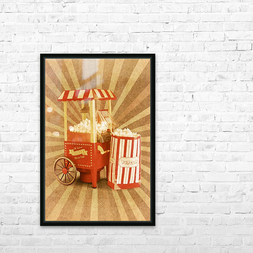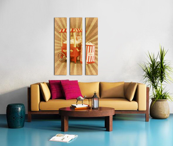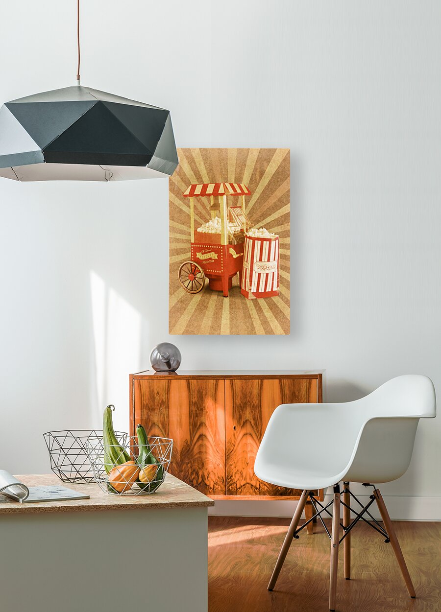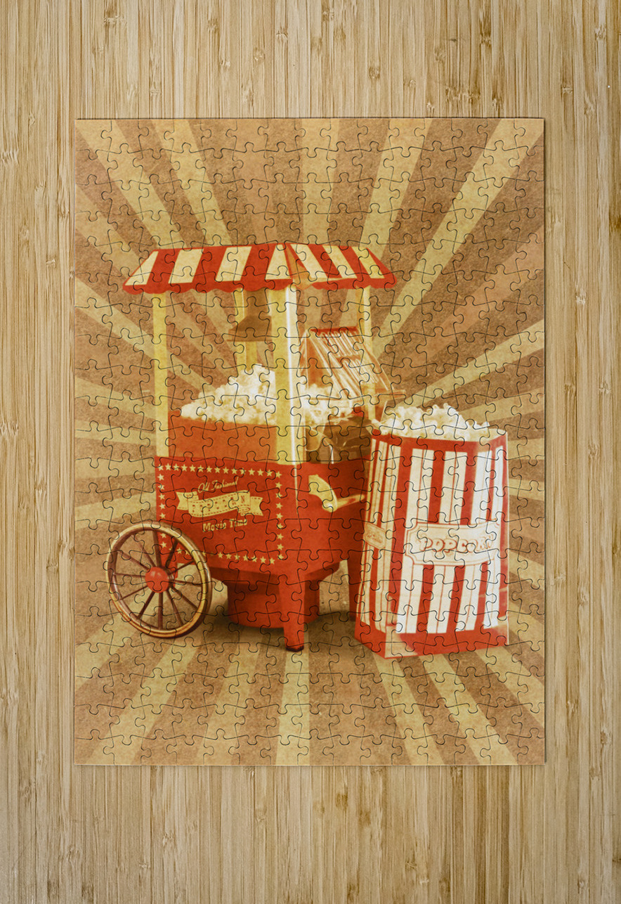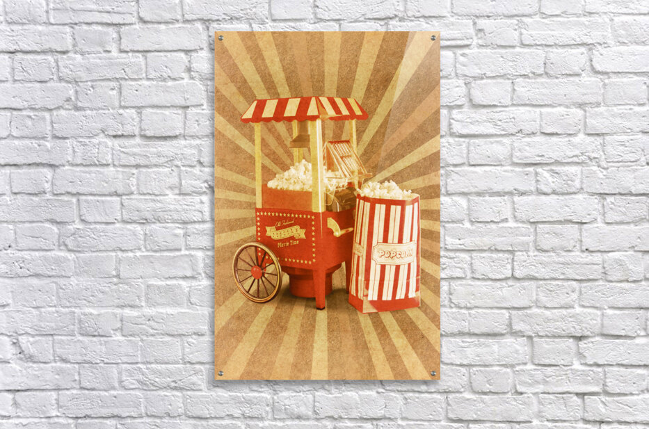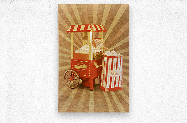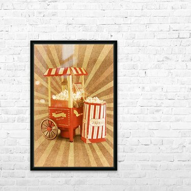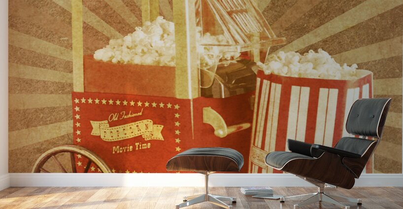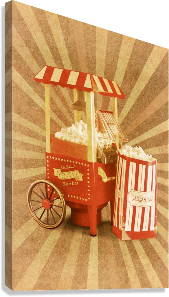 Vintage movie scene in snack bar nostalgia with popcorn cart and old commercial carton. Salted cinema