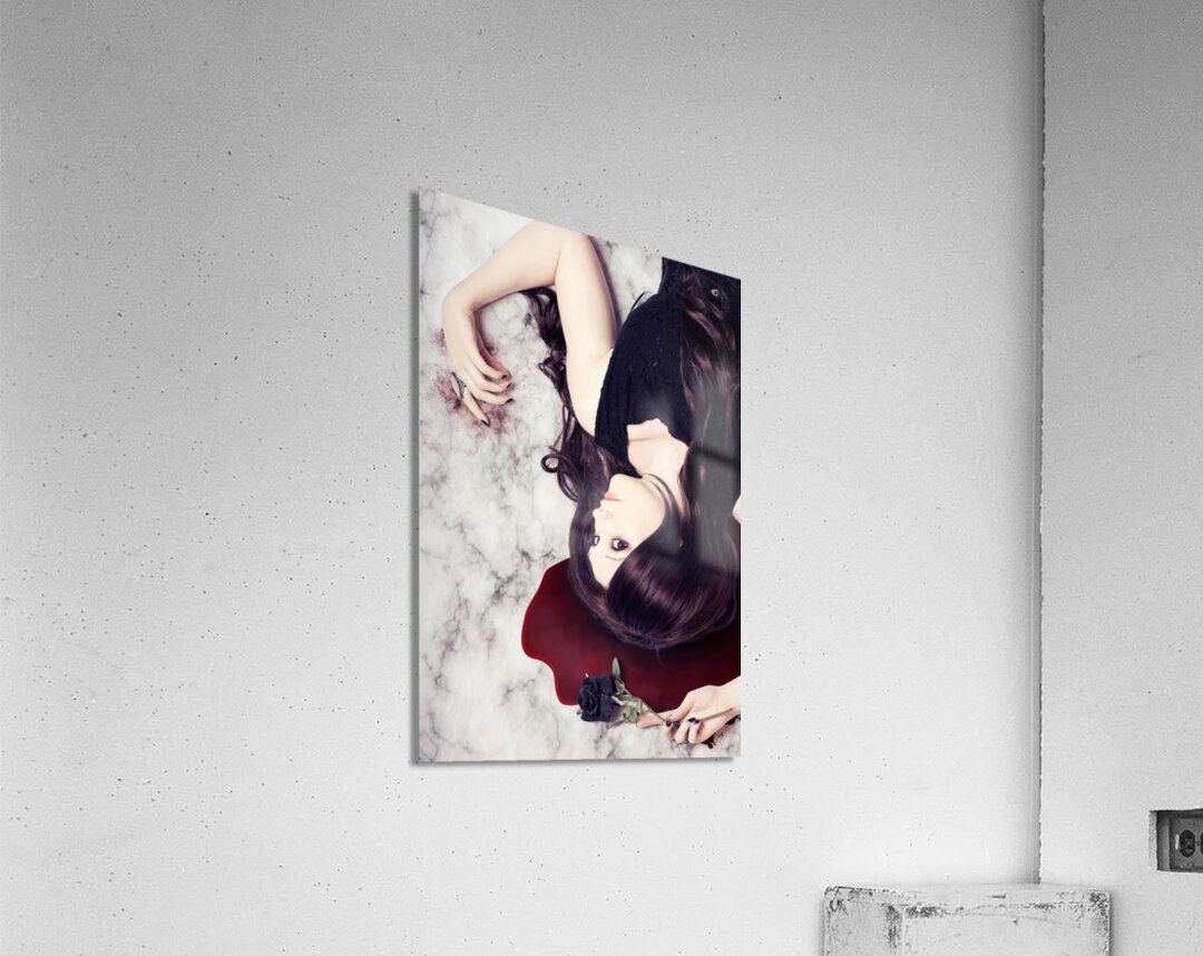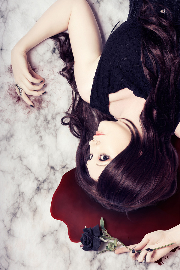 Haunting portrait of a romantic gothic woman holding black rose while lying dead on a marble stone floor in a puddle of blood. In love and death