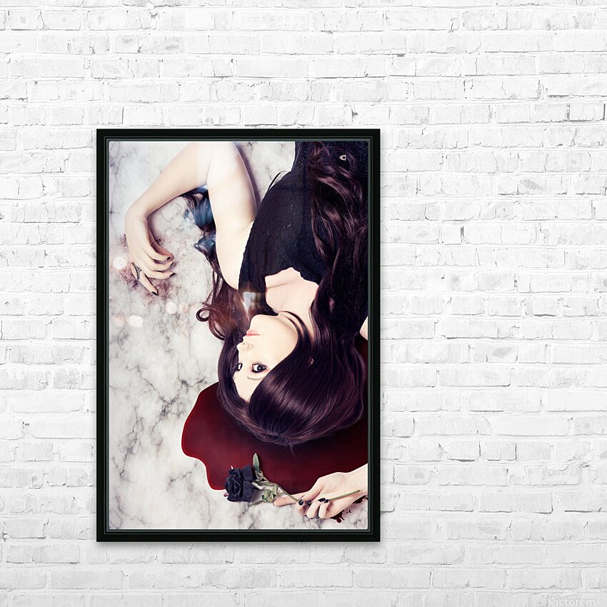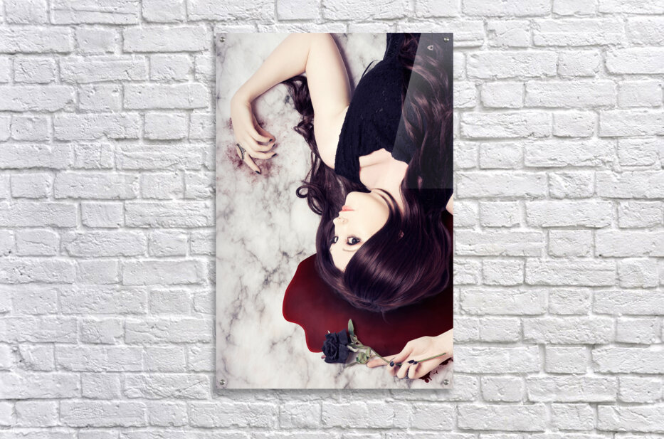 Dead woman holding black flower in blood puddle Picture Frame Printing