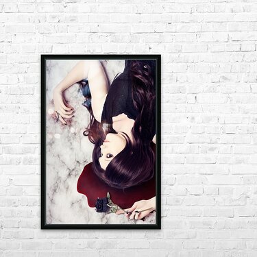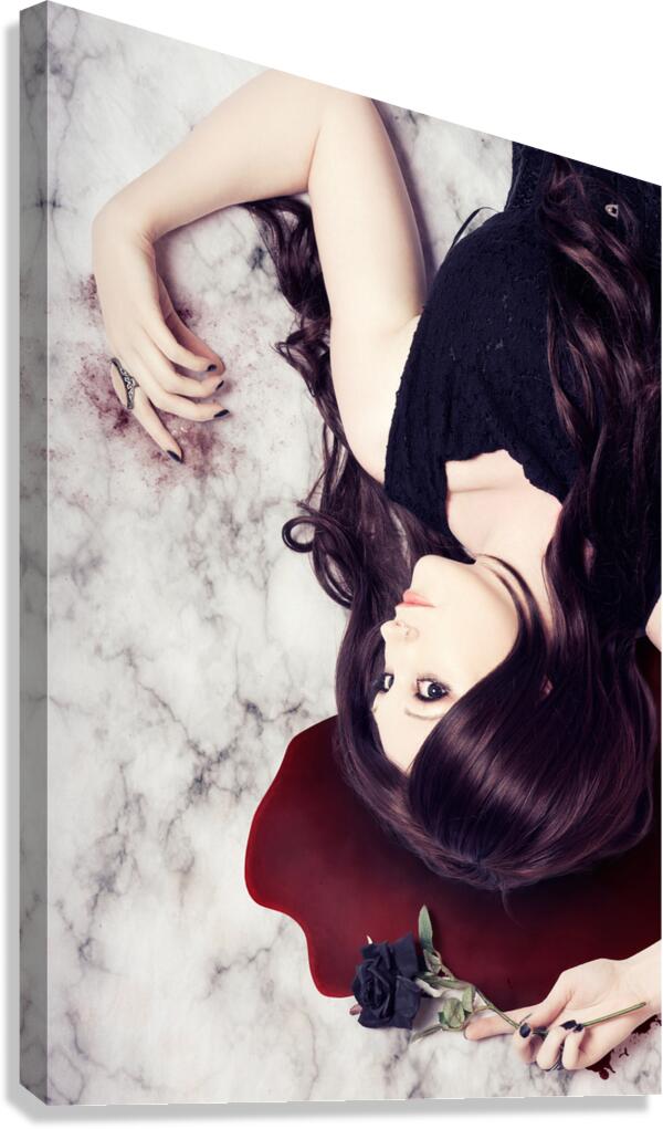 Get this artwork "Dead woman holding black flower in blood puddle" in a framed print.