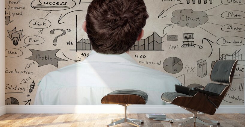 Creative businessman looking to develop innovative business plan when looking to hand drawn marketing illustration on a texture wall