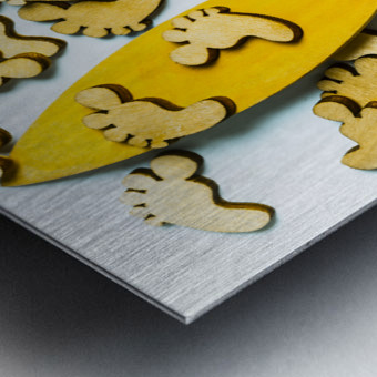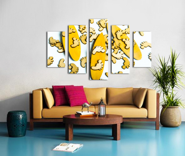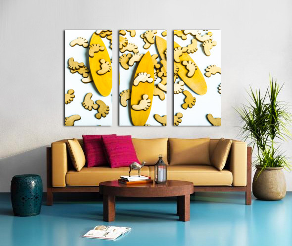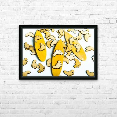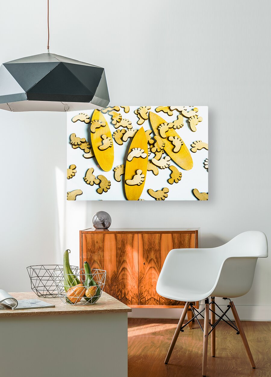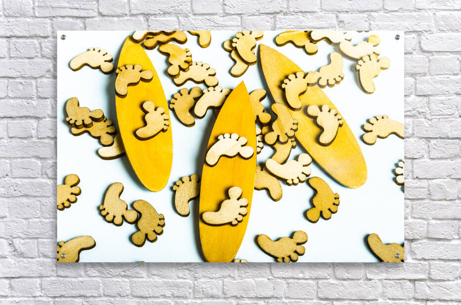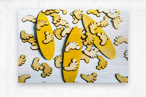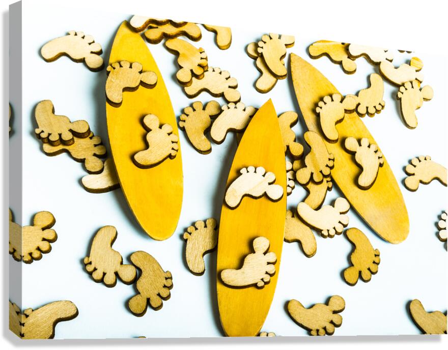 Hang 10 in a scene of wooden decorative feet riding still life surfboard waters