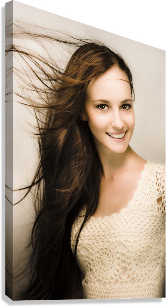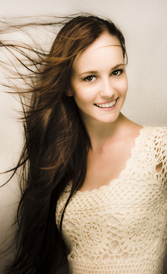 Beautiful smiling natural young woman with the wind blowing through her long brunette hair