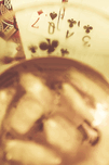 Macro of glass of whiskey with ice playing cards in the background spelling out the word love gambling concept