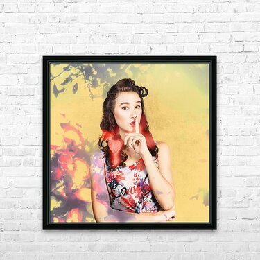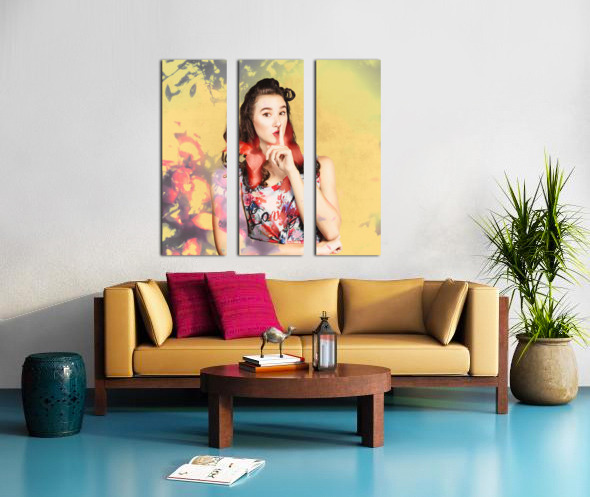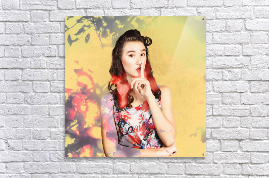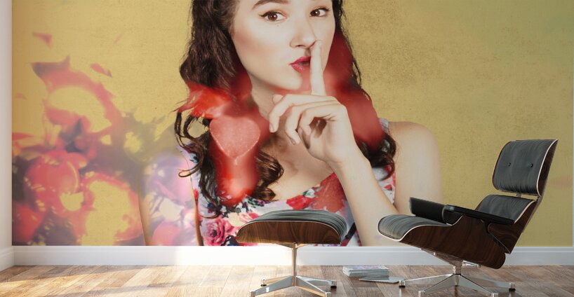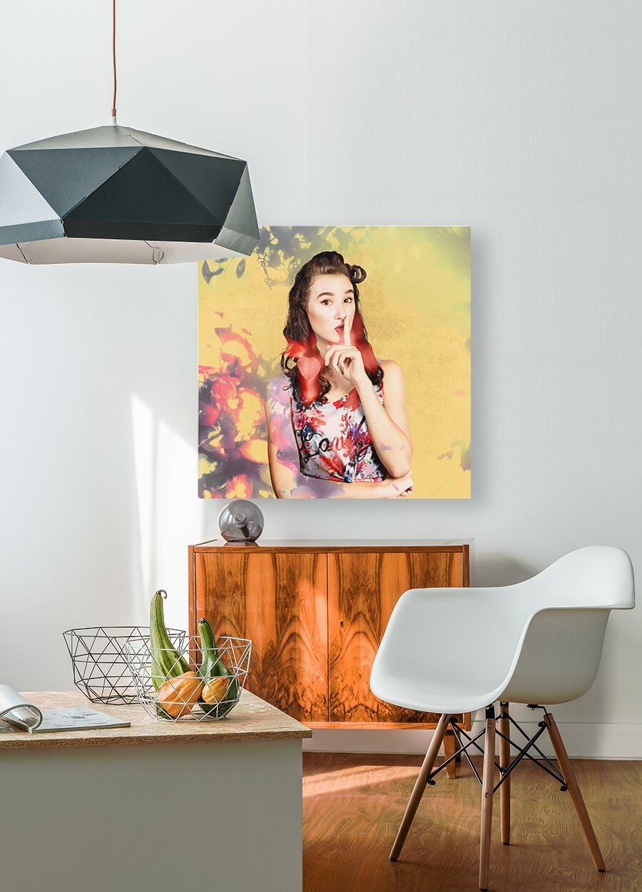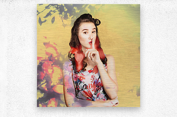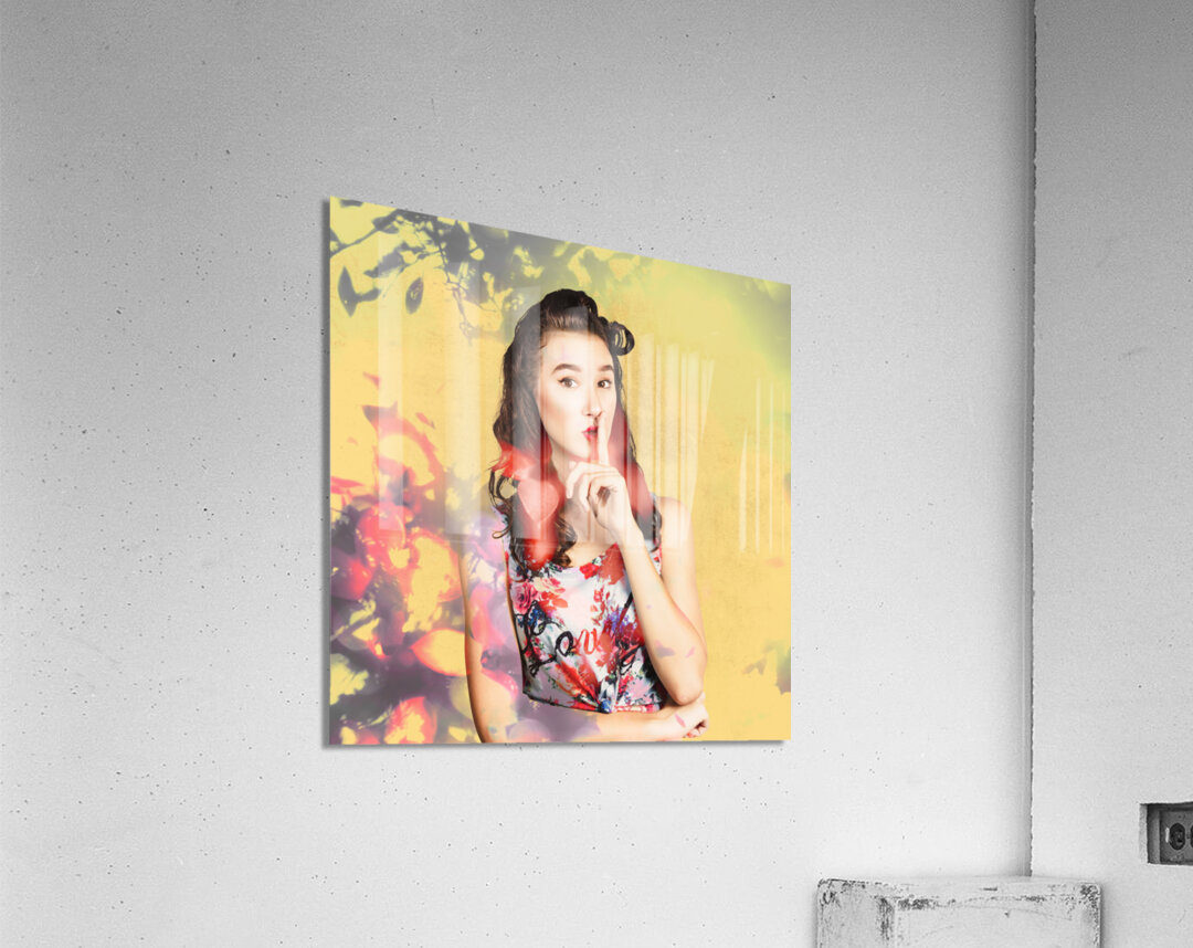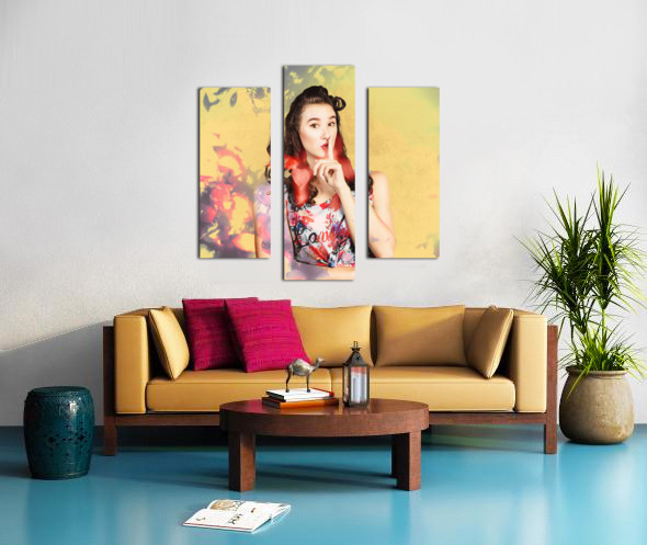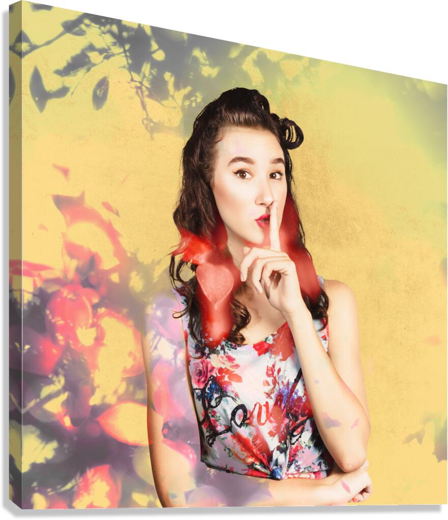 Ornate vintage fashion portrait of a colourful pinup woman whispering quiet amongst a blur of abstract lights colors and shadows. Women style secrets