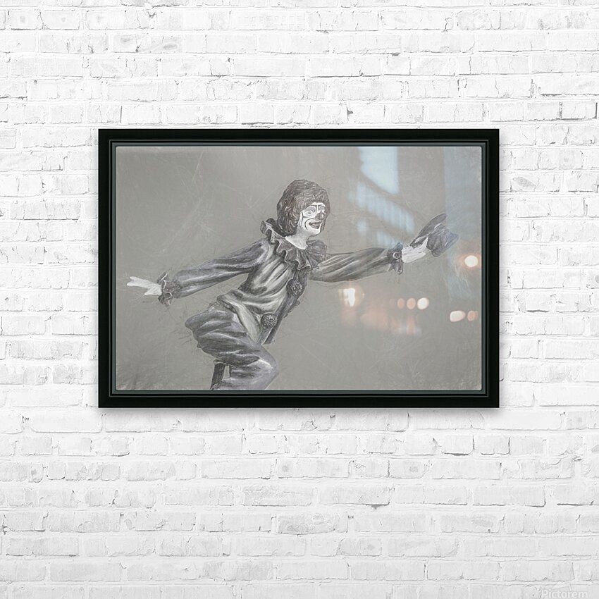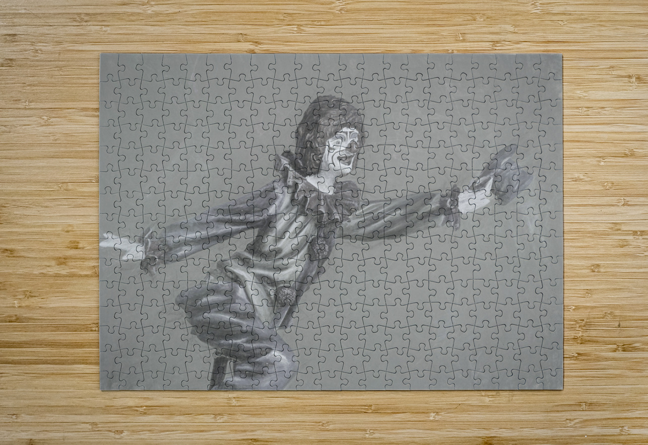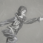 Vintage drawn out scene of monochromatic festivity with performance clown taking a hats off bow