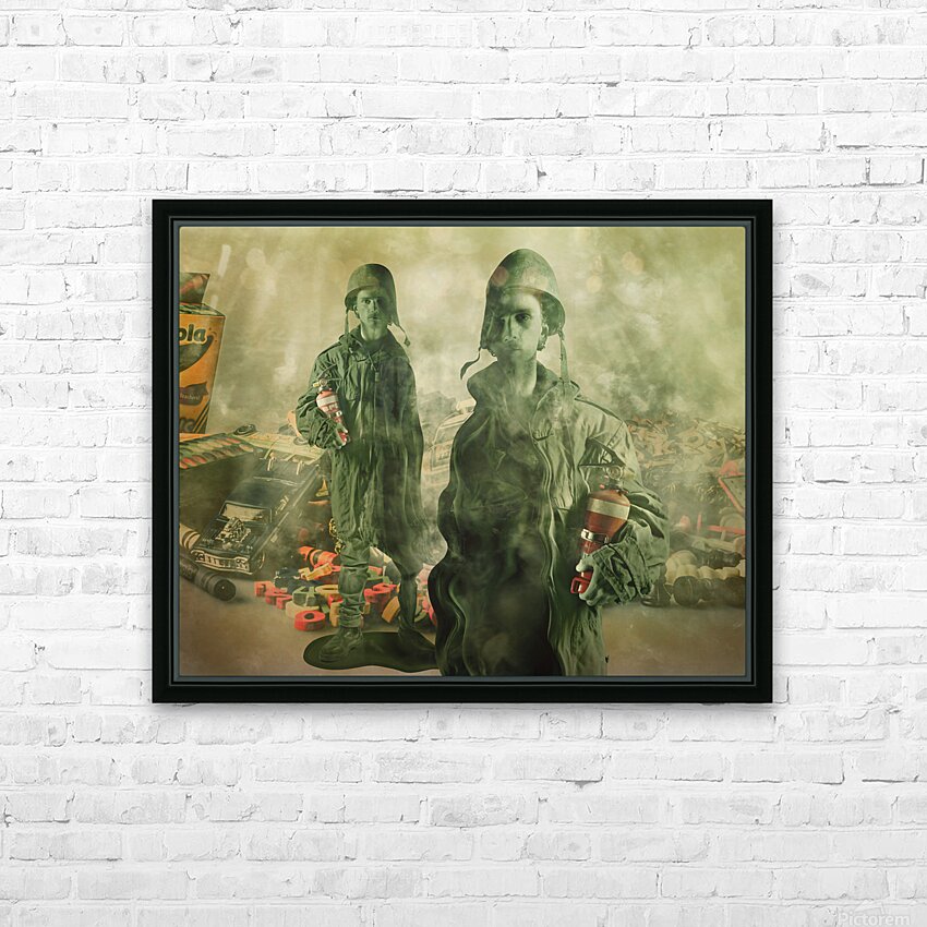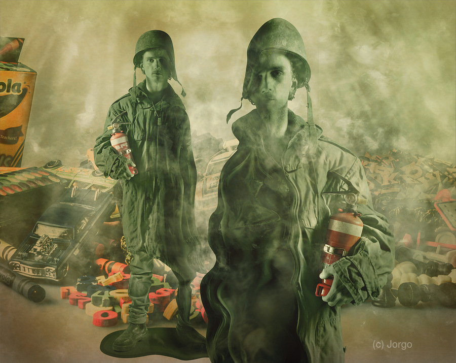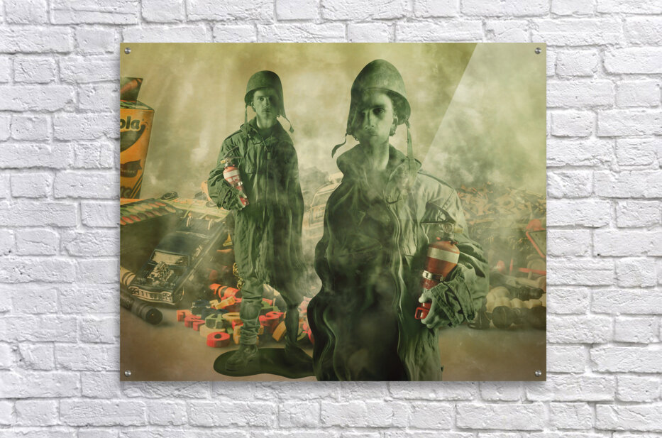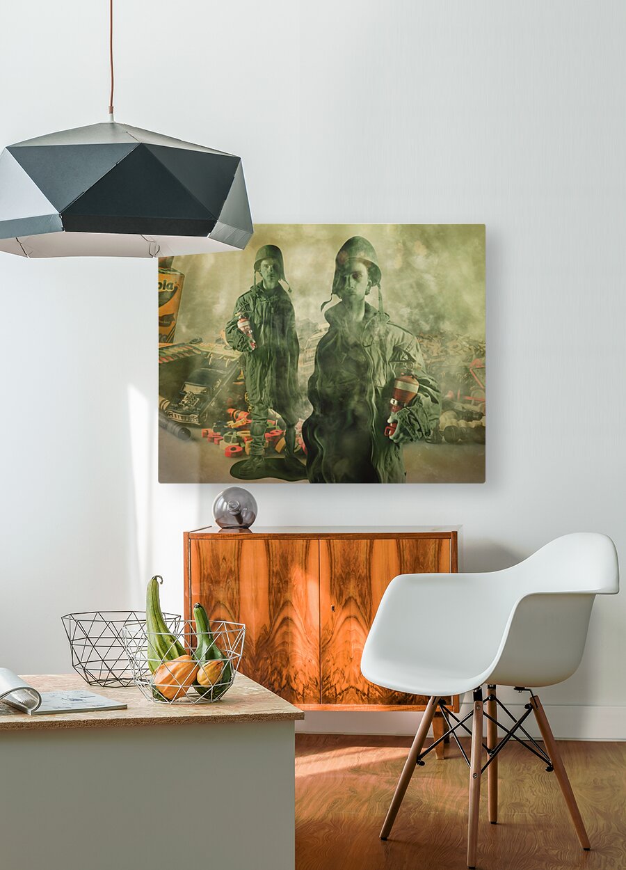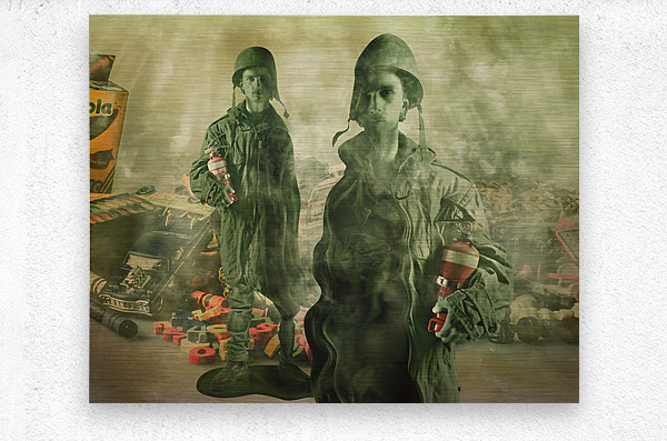 Surrealist scene of games gone wrong with melted toy soldiers their faces long and fake war games spun out to control