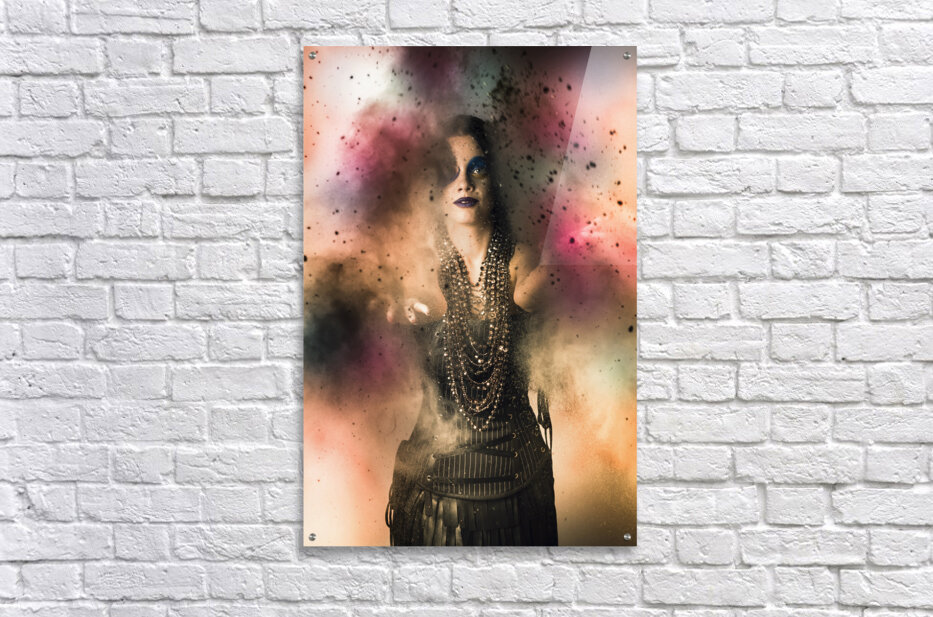 Magical female jester bedecked in jewellery casting a medieval spell while throwing a cloud of colourful magic powder to invoke netherworld spirits in a mystical ritual