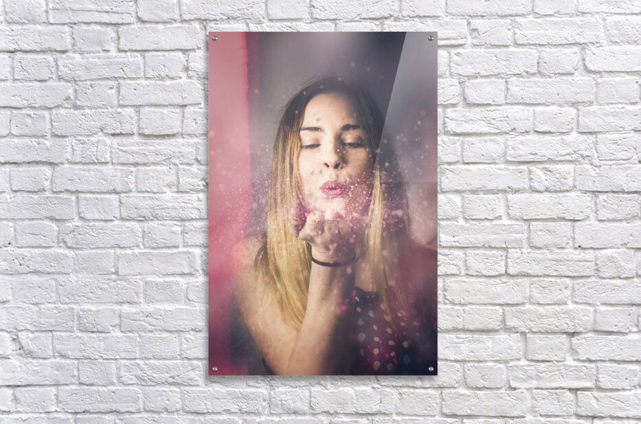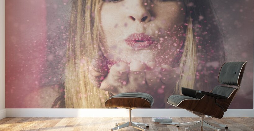 Creative pink abstract portrait on the face of a beautiful woman blowing a burst of magic glitter at valentines day party celebration. Valentine girl making wish kiss