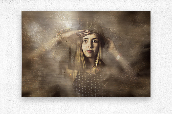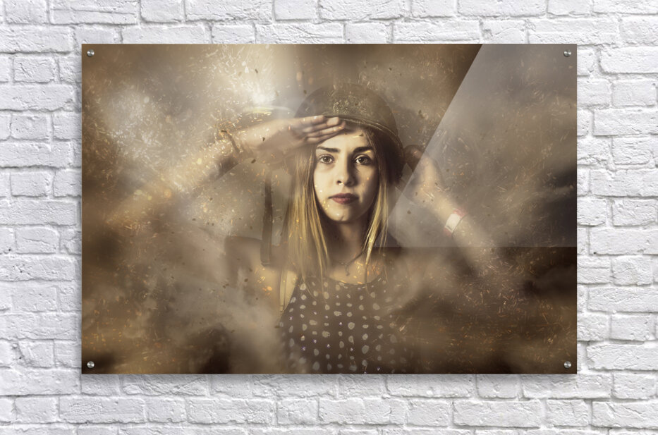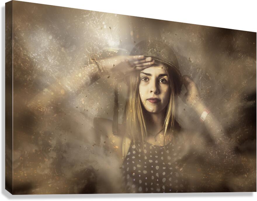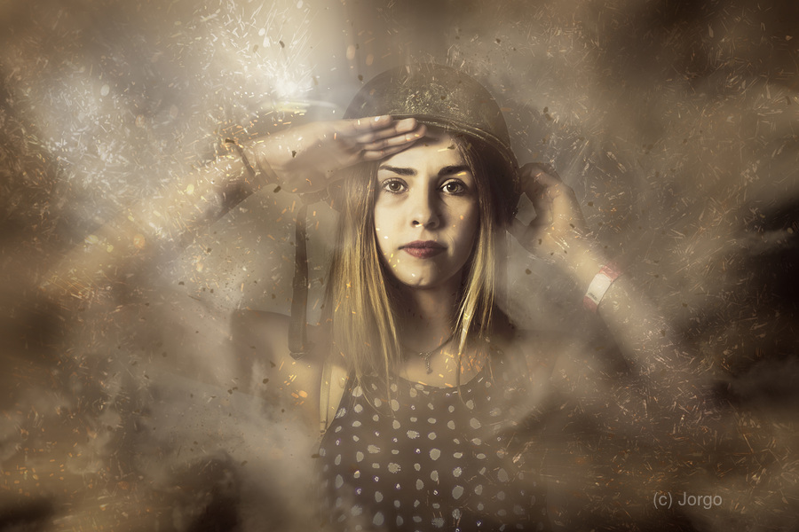 Fine art military photo of a strong tough and beautiful pinup soldier girl saluting when guarding a explosive fort in shrapnel sprays of dust and smog...[+]
