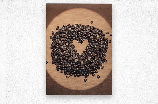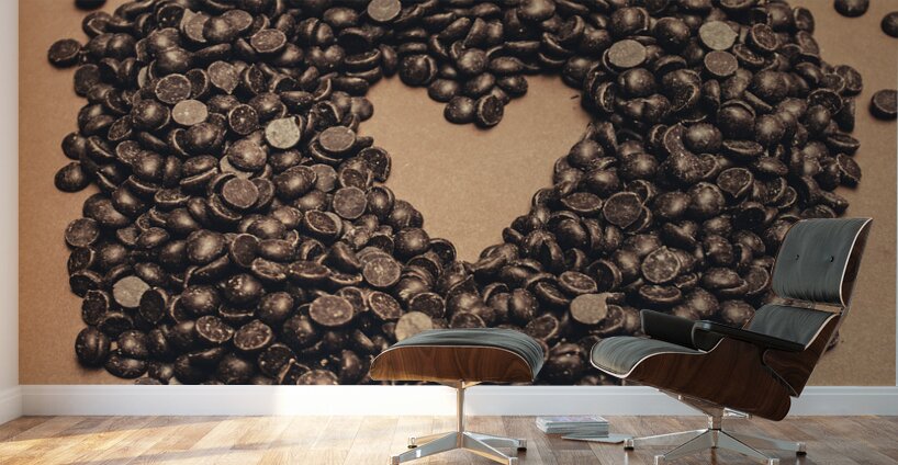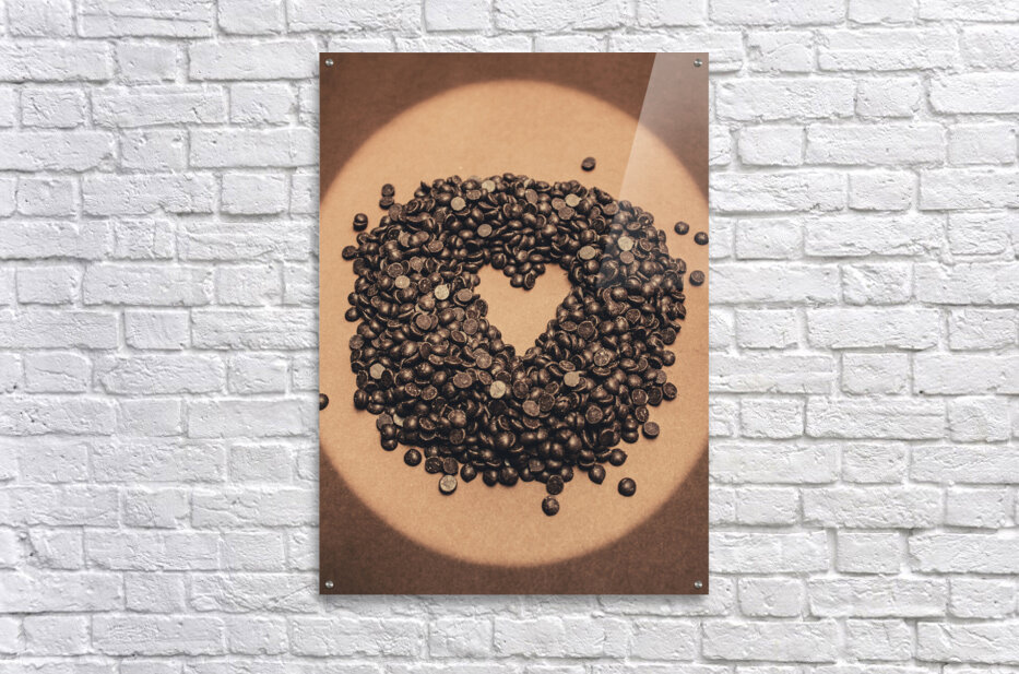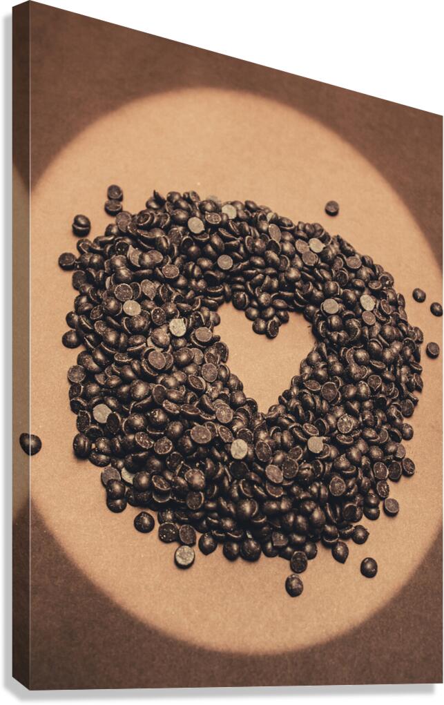 Still-life food photography on a pile of small chocolate baking drops in heart shape. Cooking desserts with love