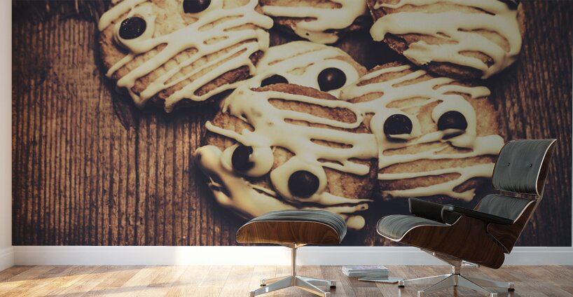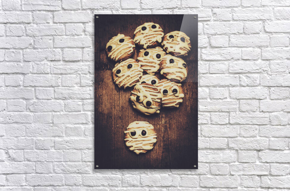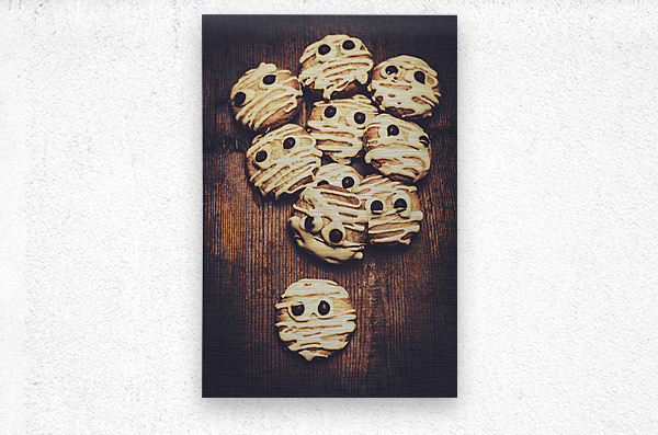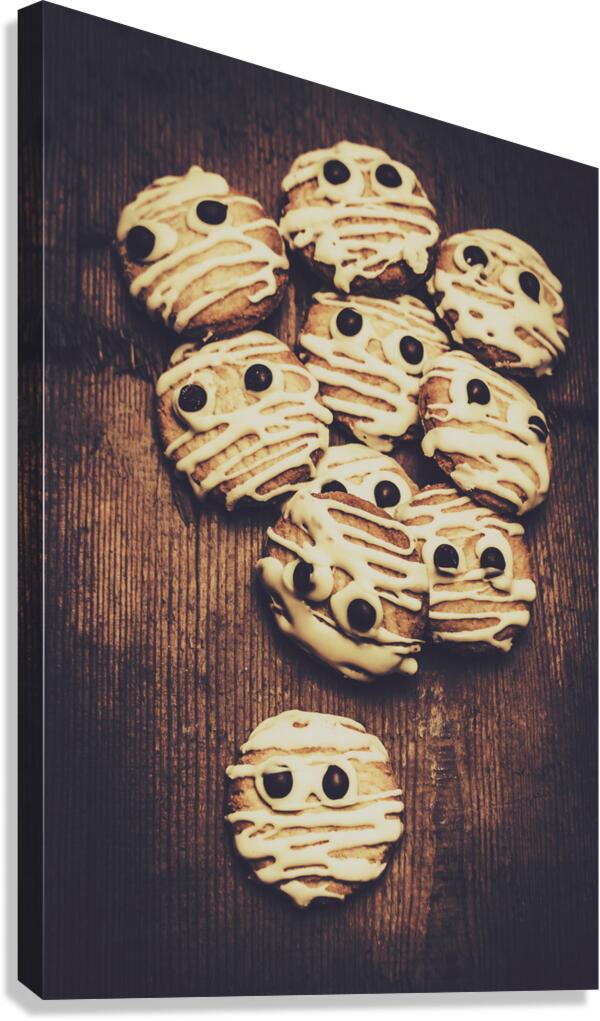 Halloween cooking conceptual of frightening monster cookies wrapped in bandages of melted white chocolate. Fright night party baking
