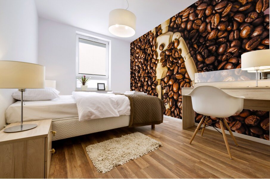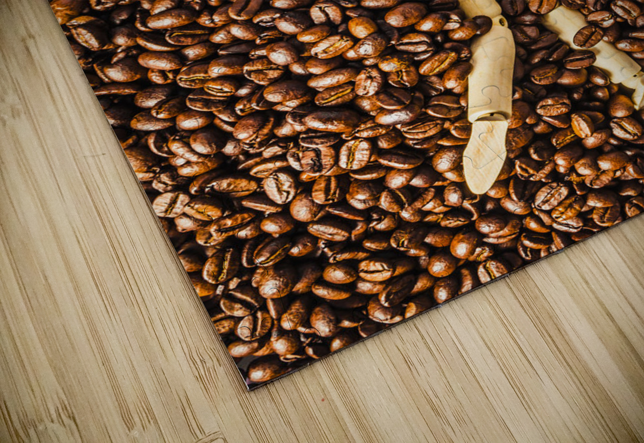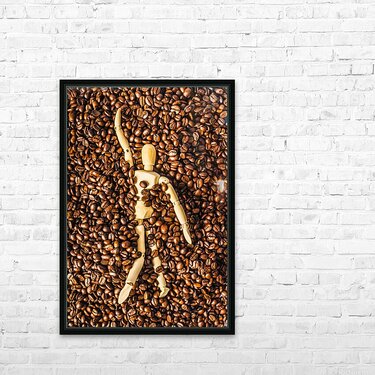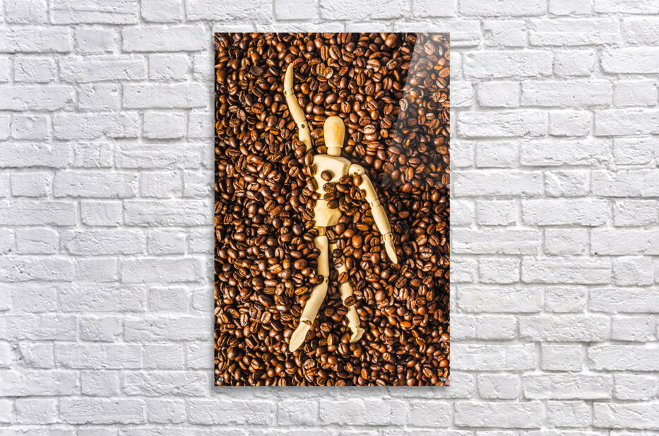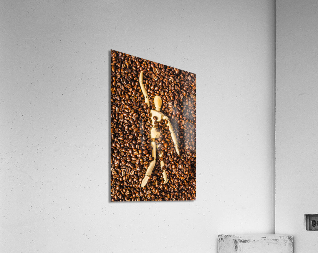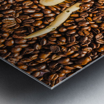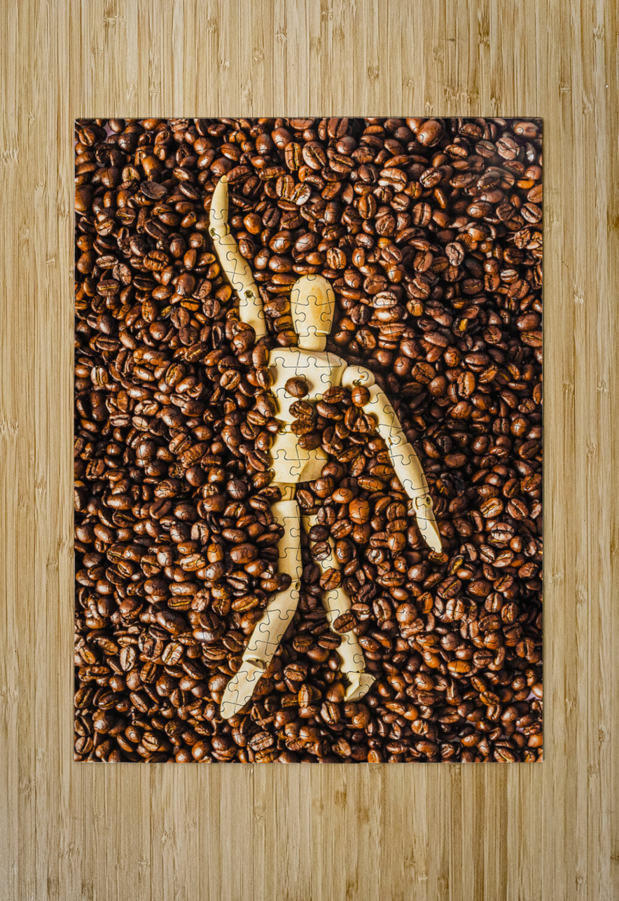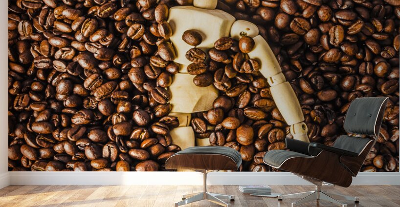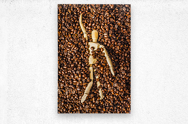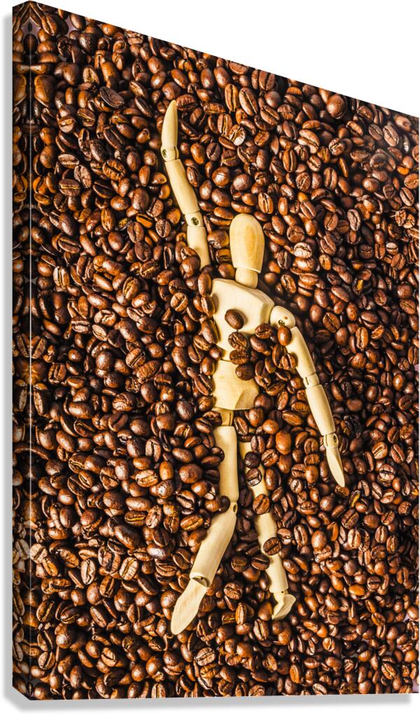 Swimming scene in coffee artwork with wooden waiter wading in waters of beans awash