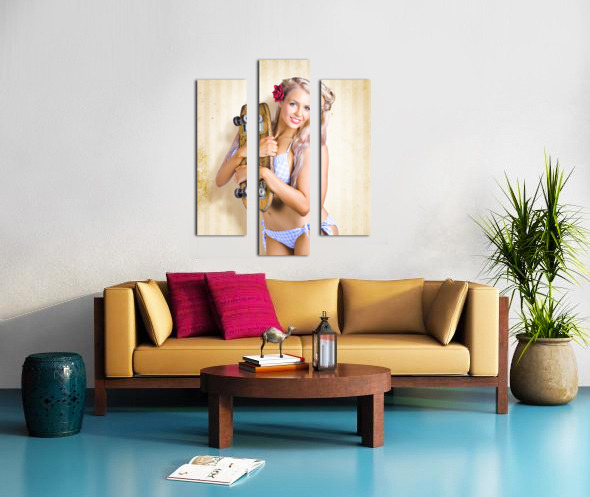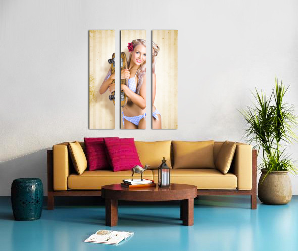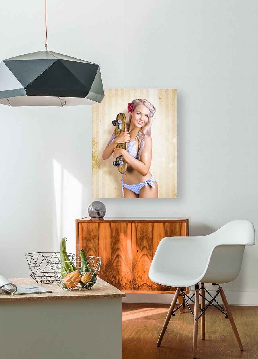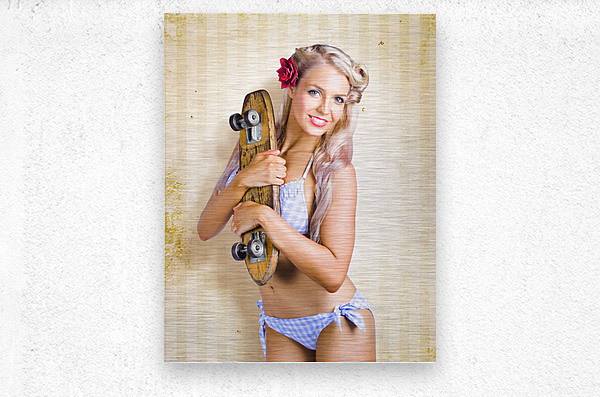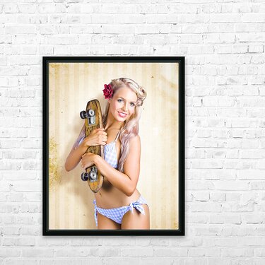 Sexy Blonde Aussie Pin-up Girl Holding A Retro Skateboard Shaped Like A Surfboard In A Representation Of The Australian Surf Skate Culture Of The 50s ...[+]
