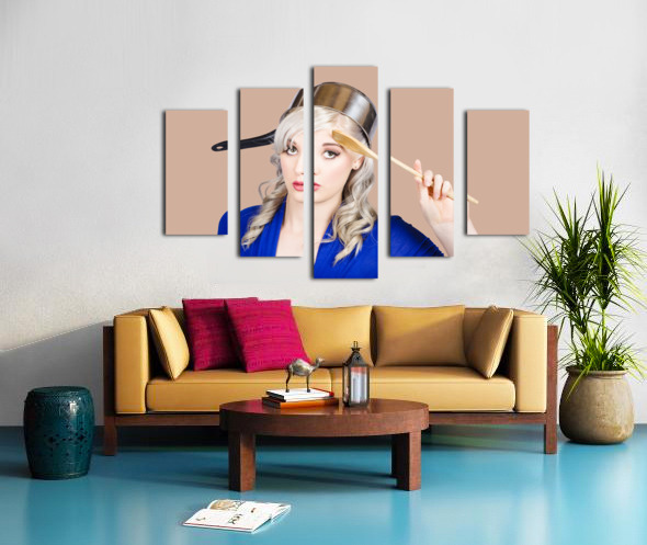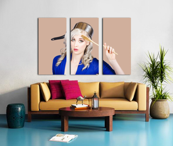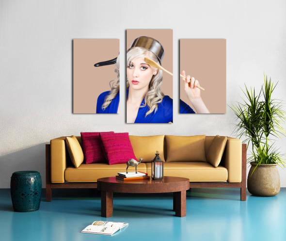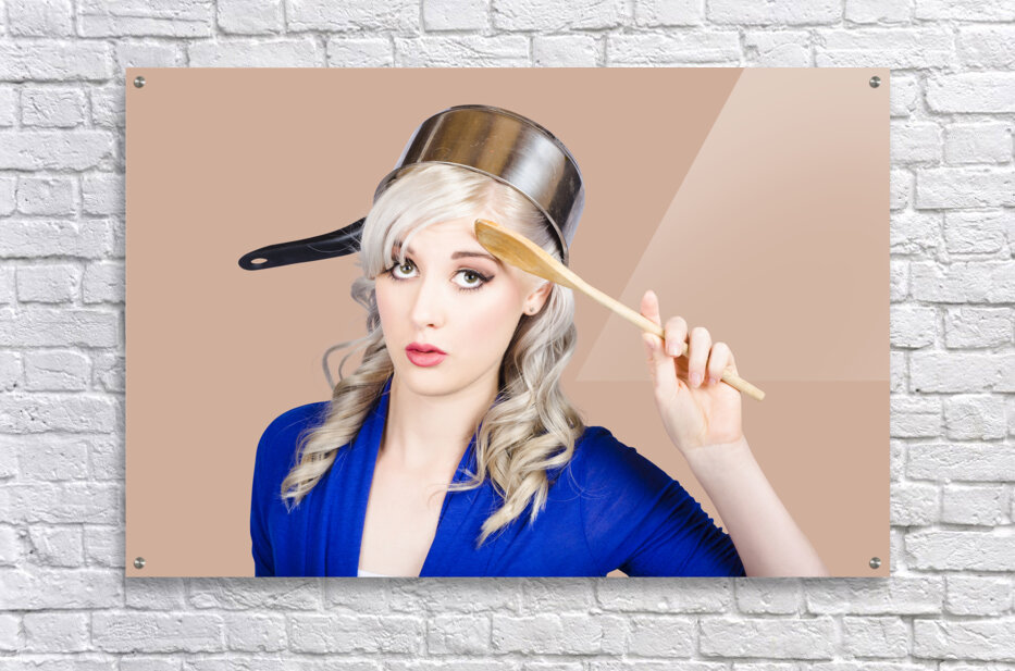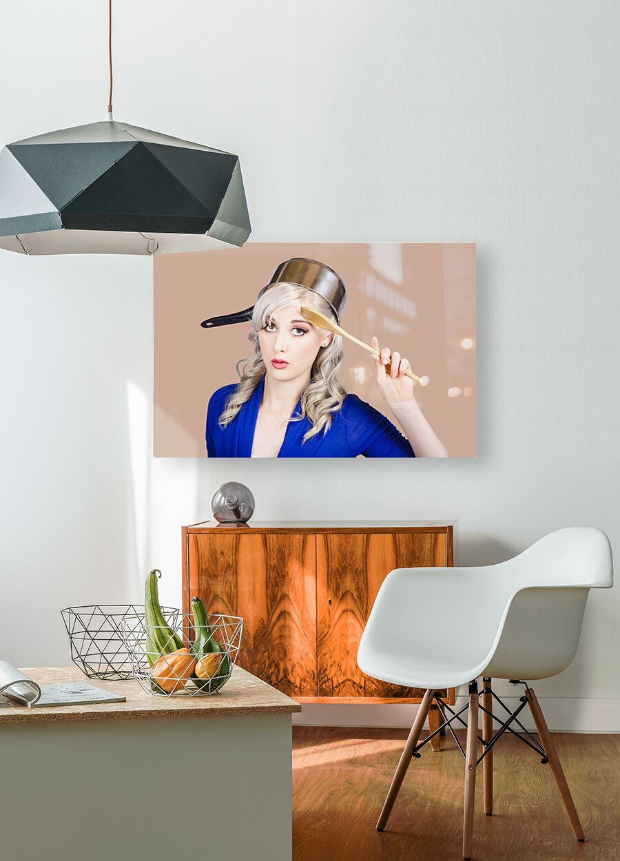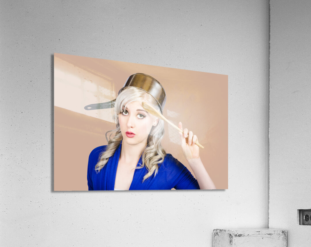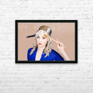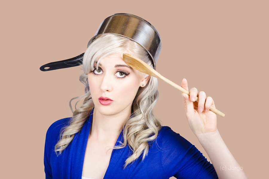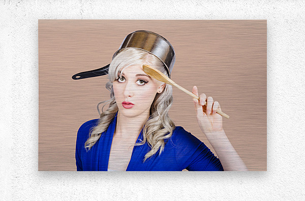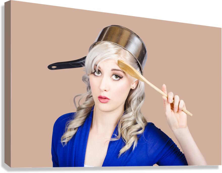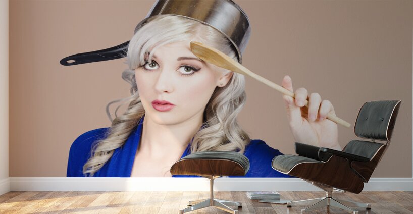Funny photograph of a beautiful blond pin up housewife with curly blond hairstyle wearing saucepan on head saluting to commence cooking duties. Feedin...[+]