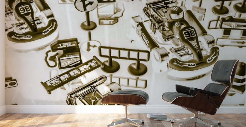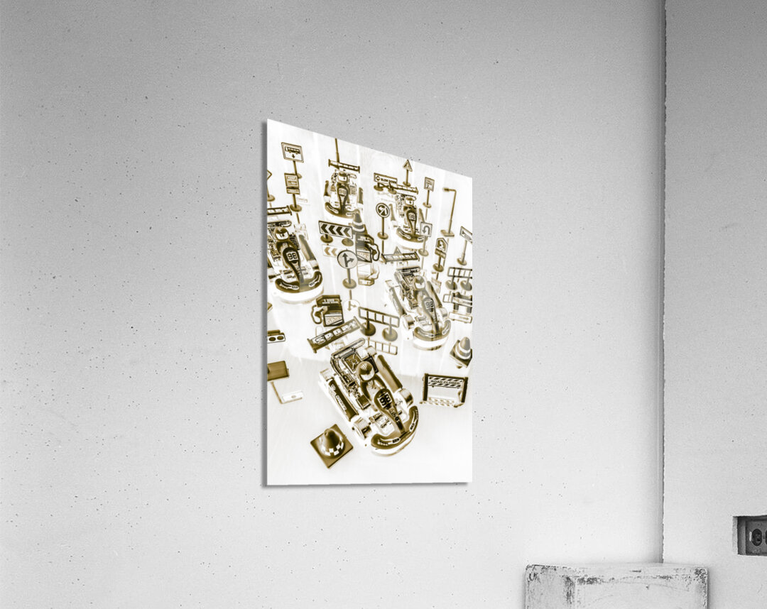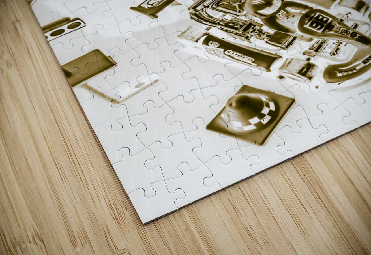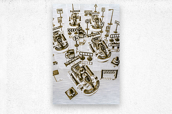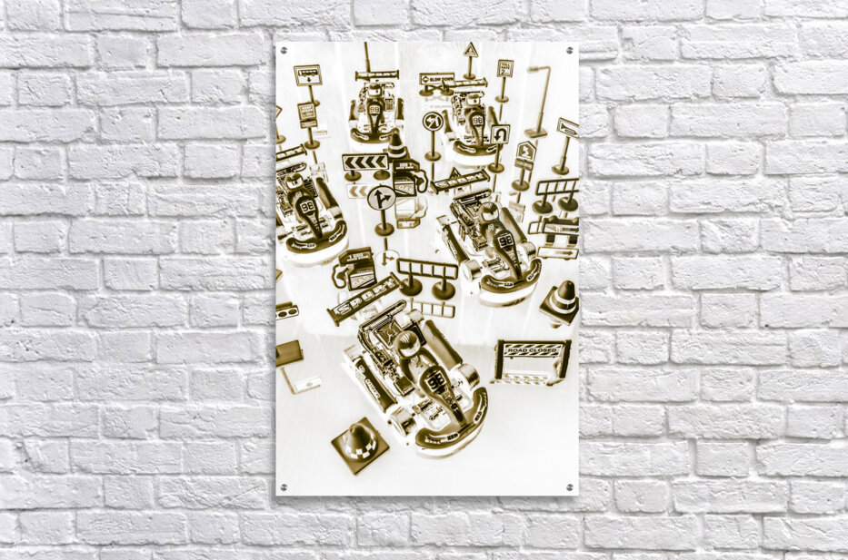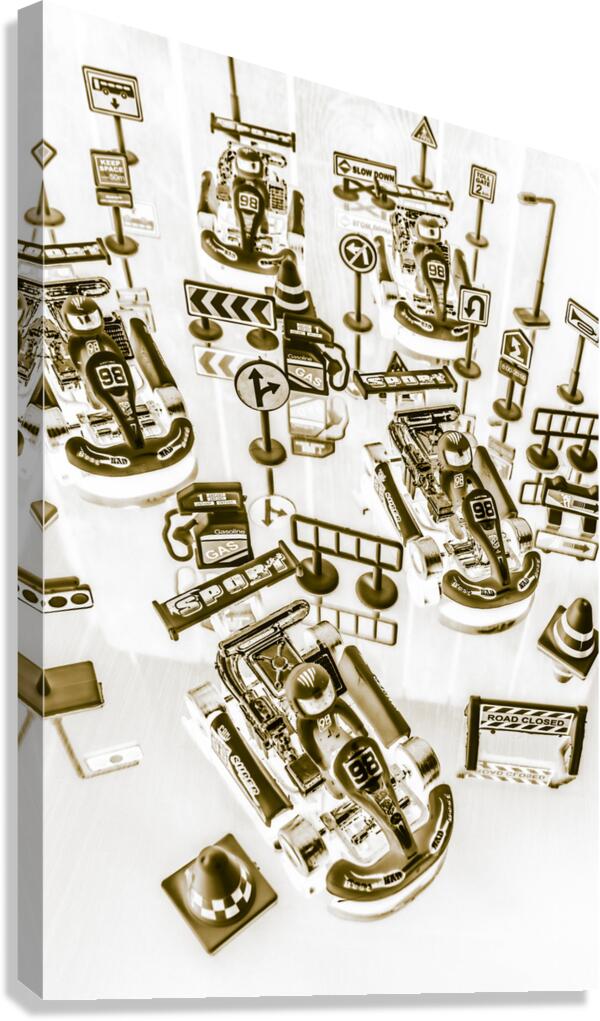 Creative sepia artwork on a mix of go-cart drivers navigating a pit stop. Racing karts