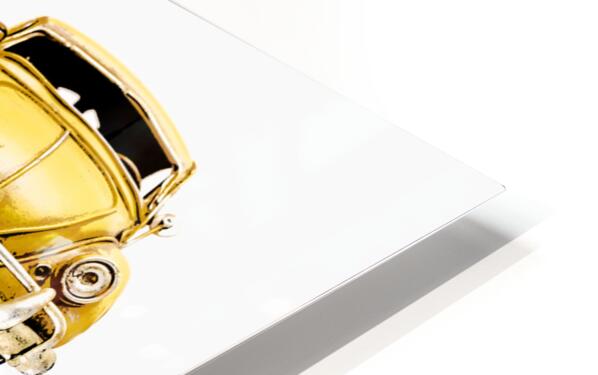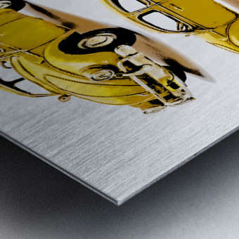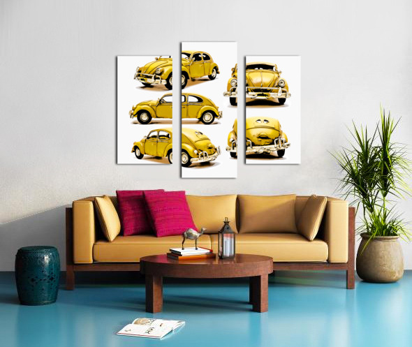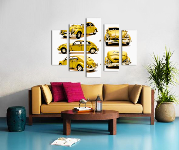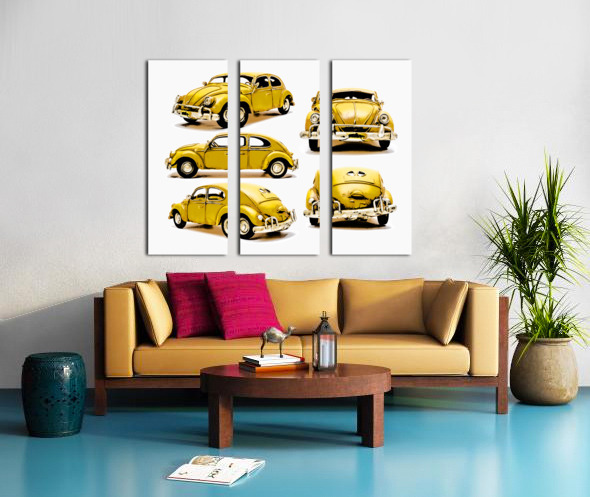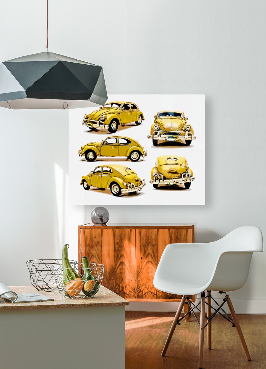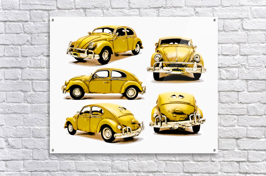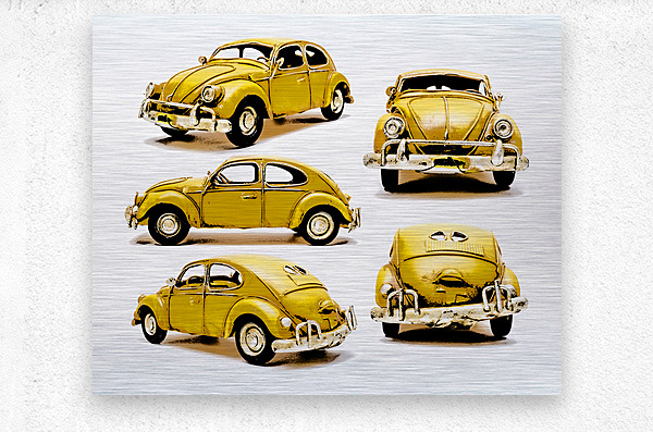 Classic car display on various angled Yellow beetles in old fashioned styling. The Retro Bug