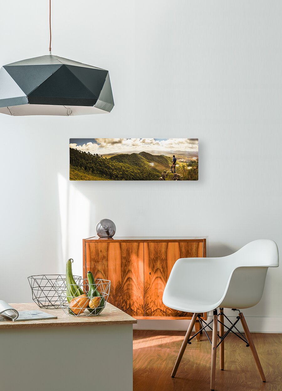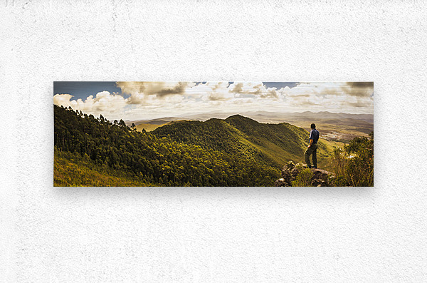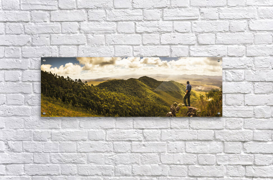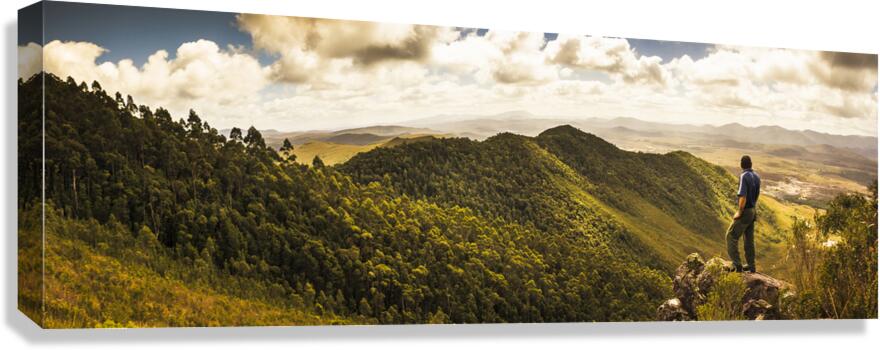 Panoramic landscape portrait on a Tasmanian man admiring vast wilderness views from halfway up Mount Zeehan Tasmania Australia