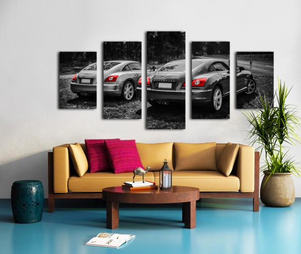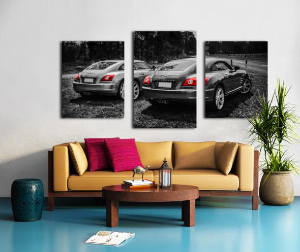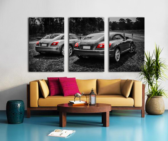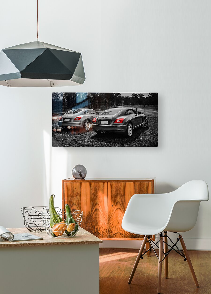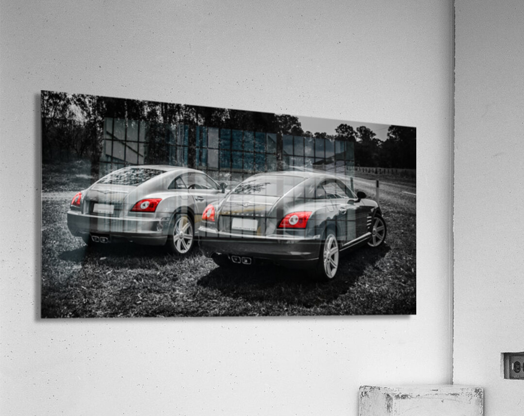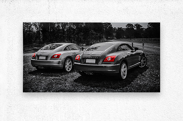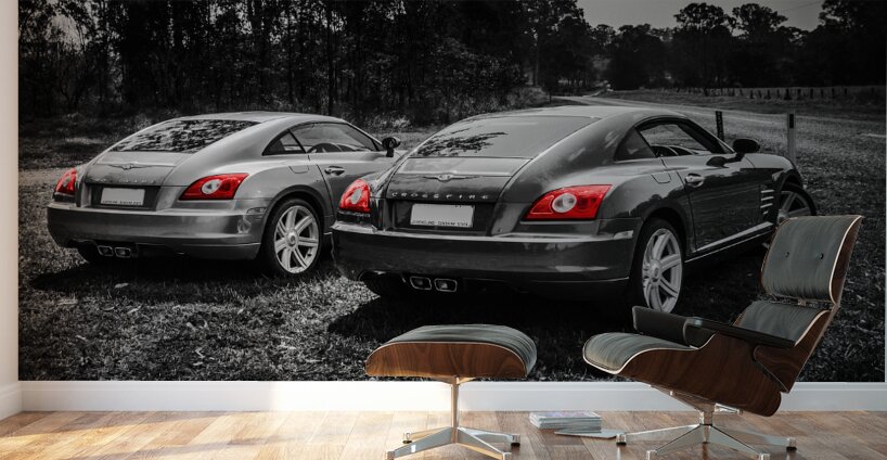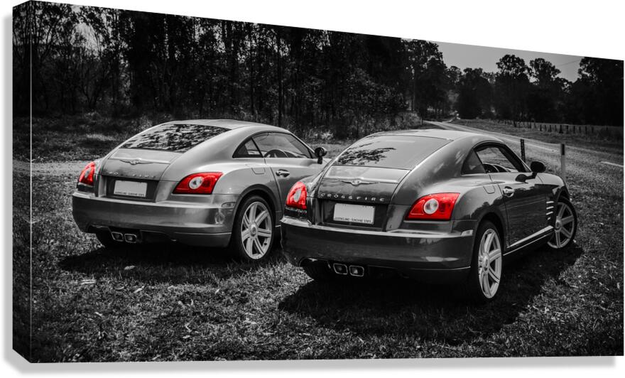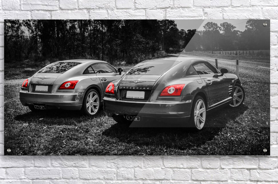 Classic car artwork on 2 Chrysler Crossfire sports cars parked on a Australian rural roadside