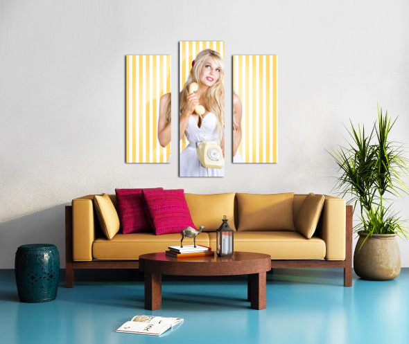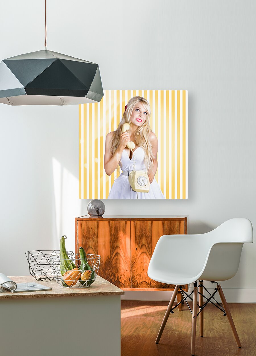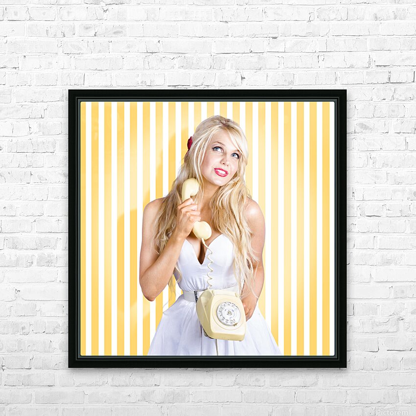 Get this artwork "Female model with phone in classic retro fashion" in a framed print.