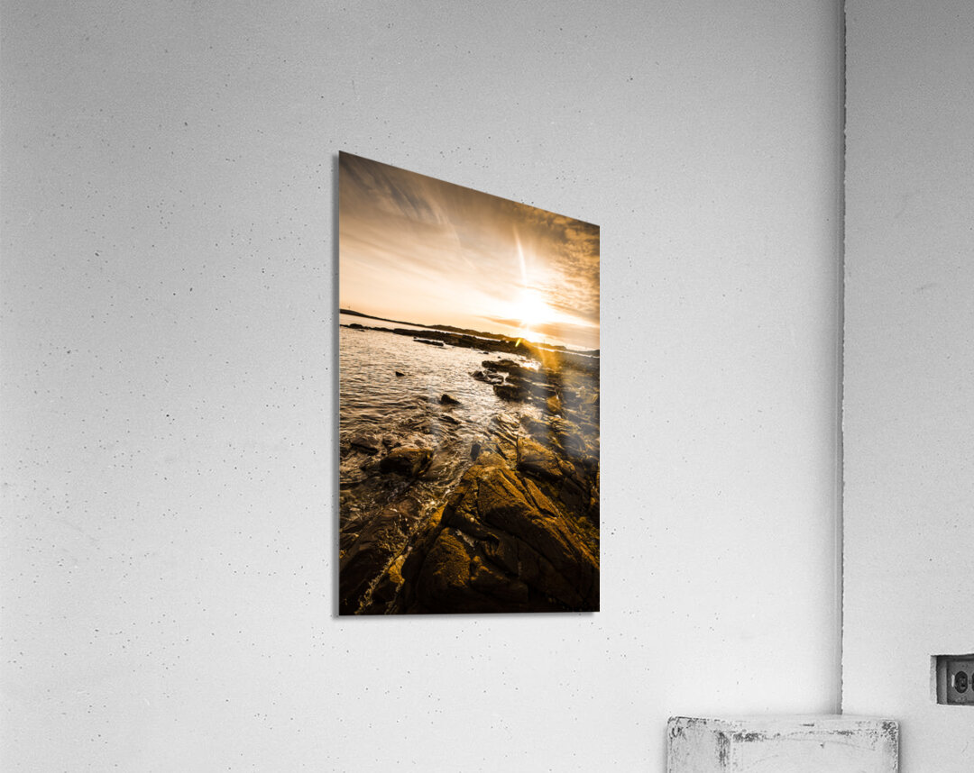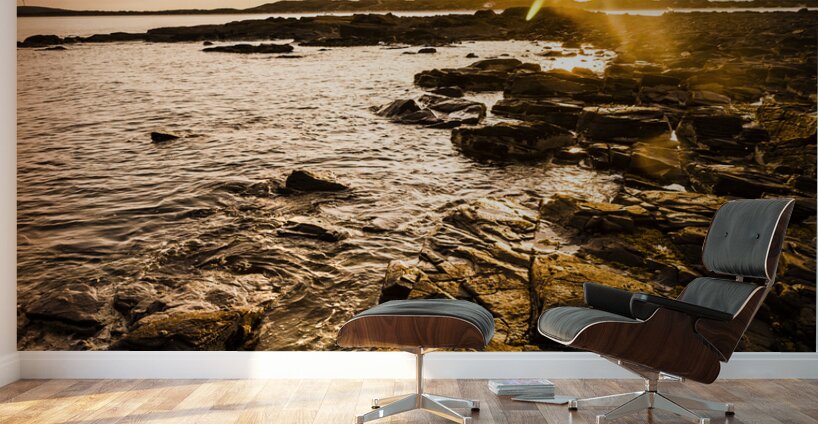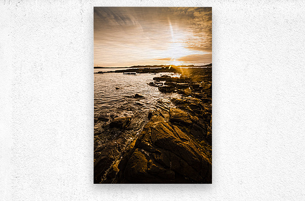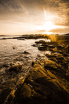 Oceanic landscape with an early morning sunrise of sun flares over peaceful coastlines. Petal point Cape Portland Tasmania Australia