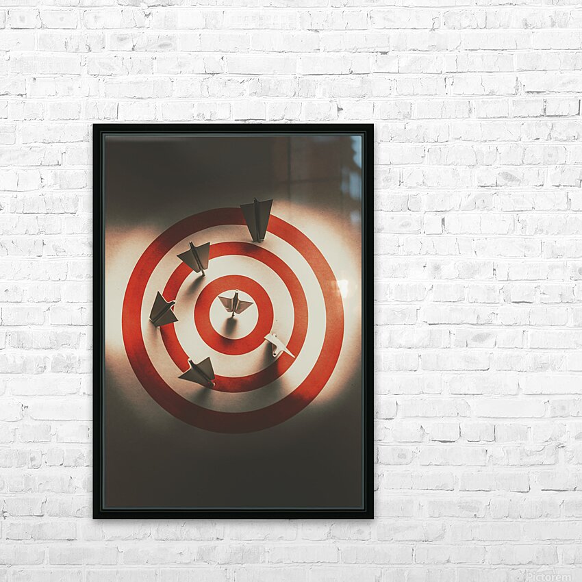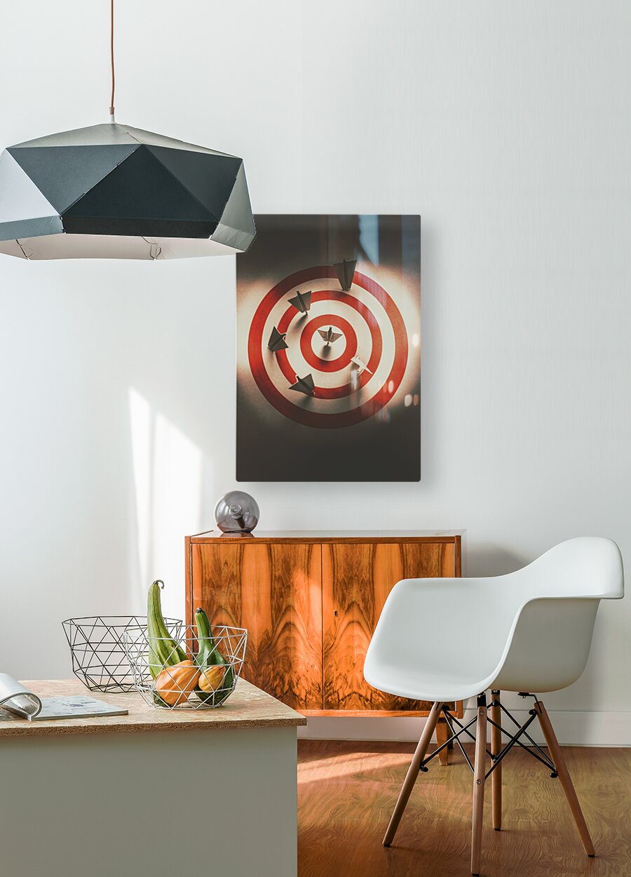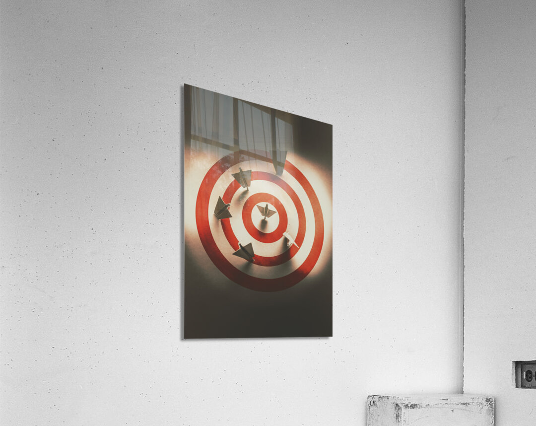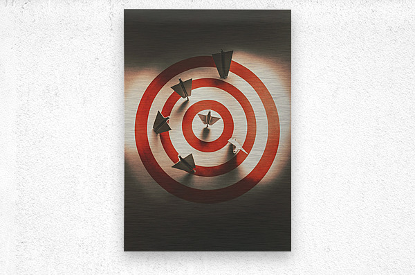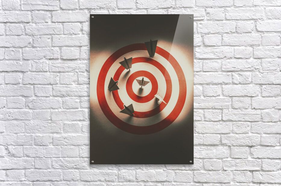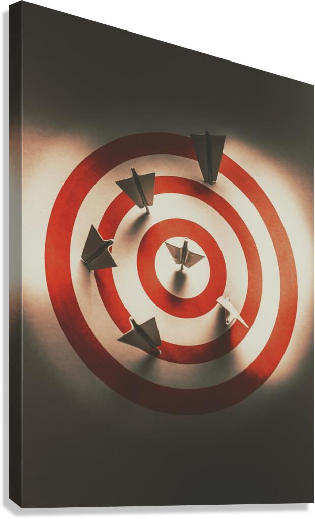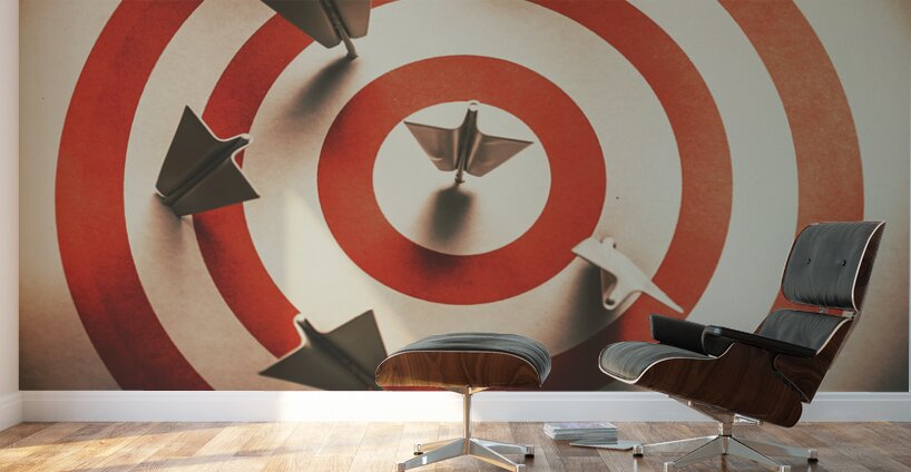 Business still life photo on pin board paper plane making hits and misses into a target sign. Pin point your target audience