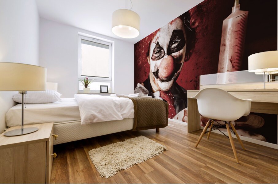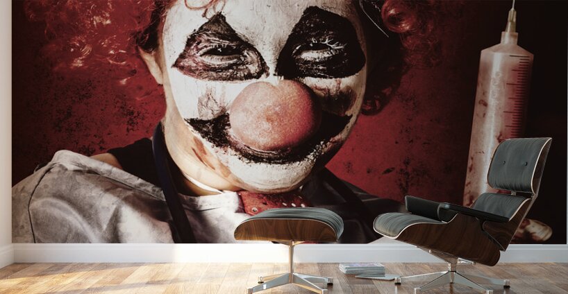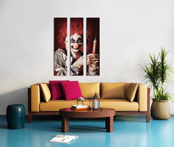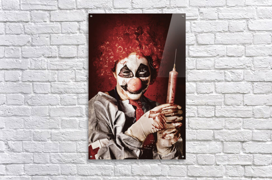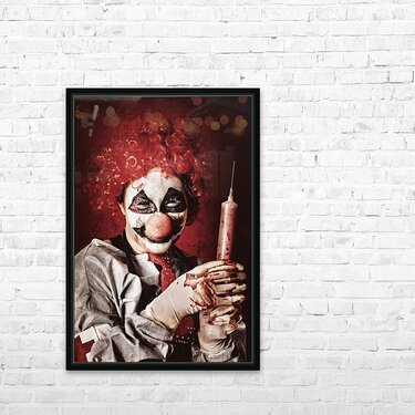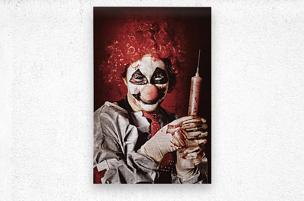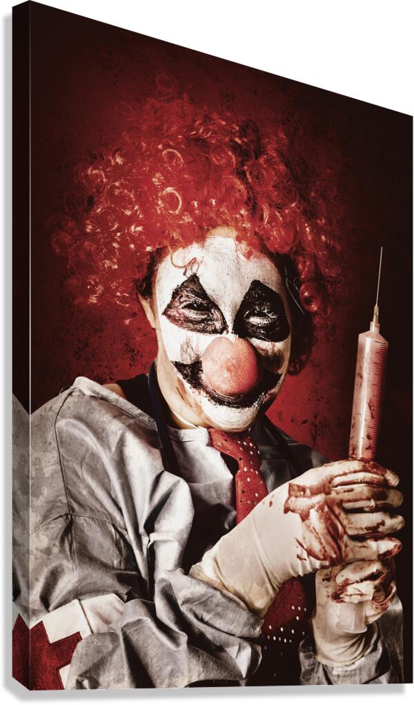 Get this artwork "Crazy medical clown holding oversized syringe" in a framed print.