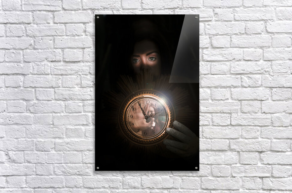 Clock Held By Young Woman Shadowed In Black With Another Woman Stuck Inside The Glass Face Of The Timepiece In A Lost In Time Concept