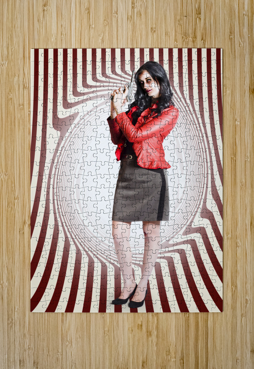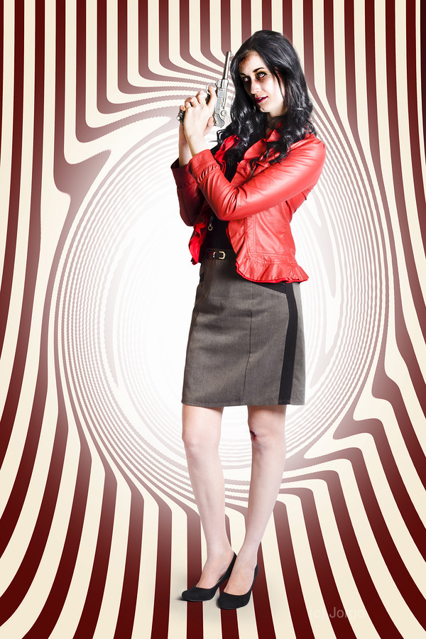 Lethal zombie secret agent holding fatal weapon with a licence to kill or be killed. Circular design background