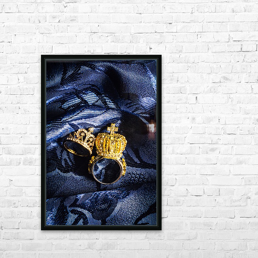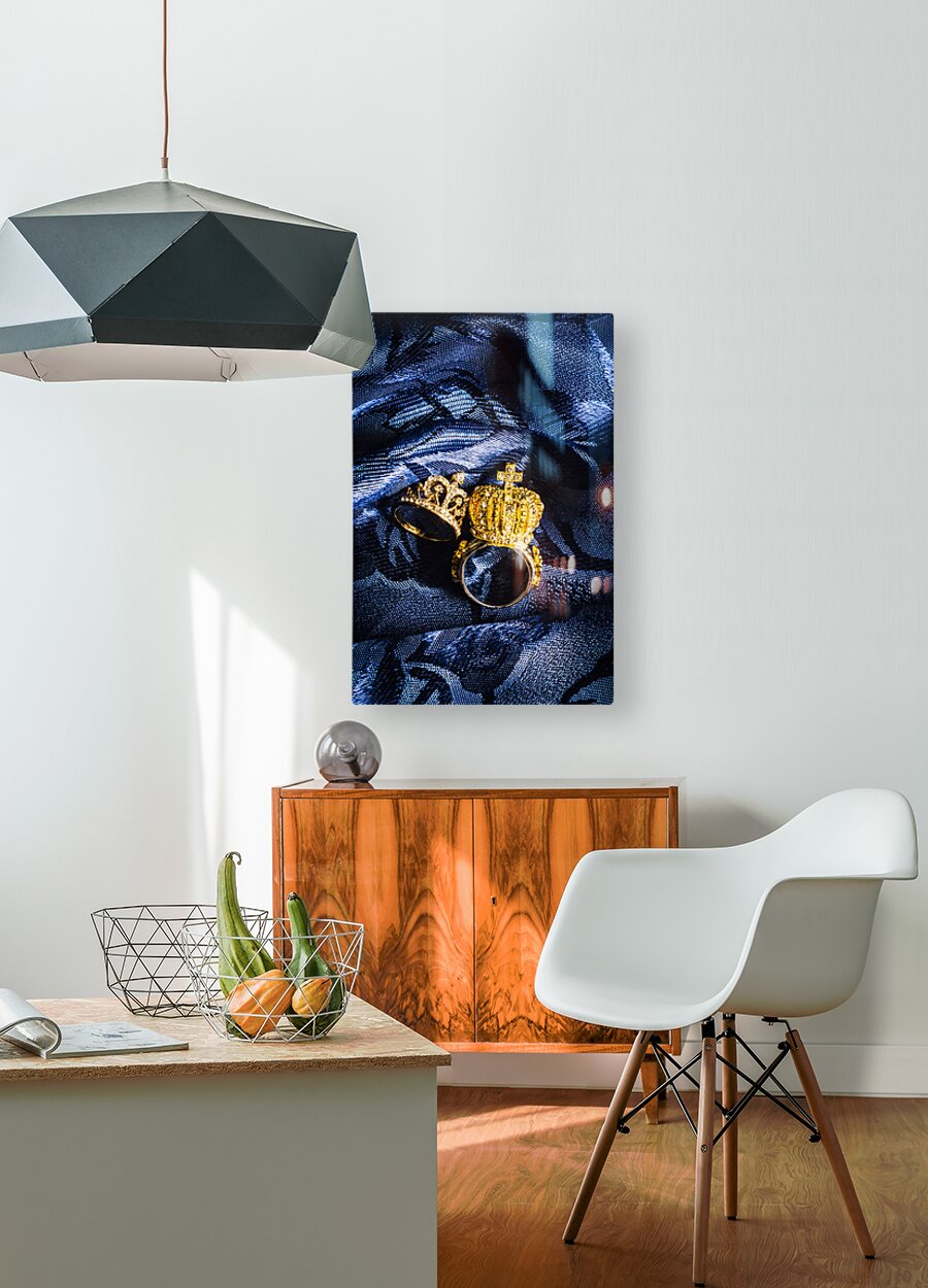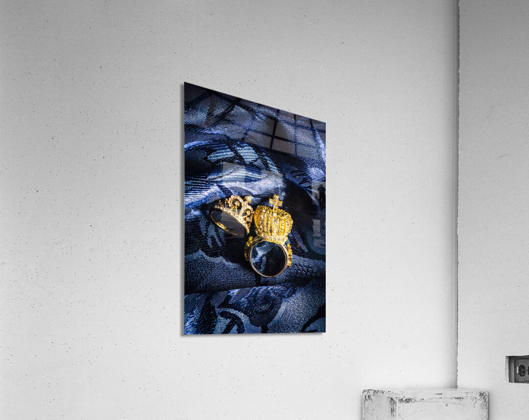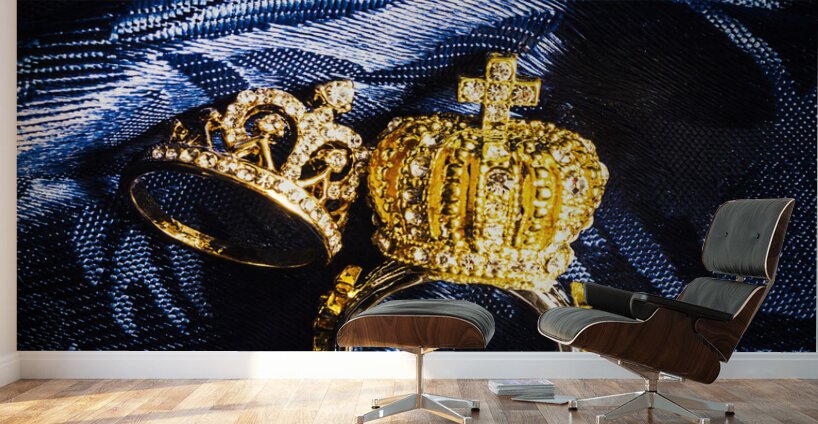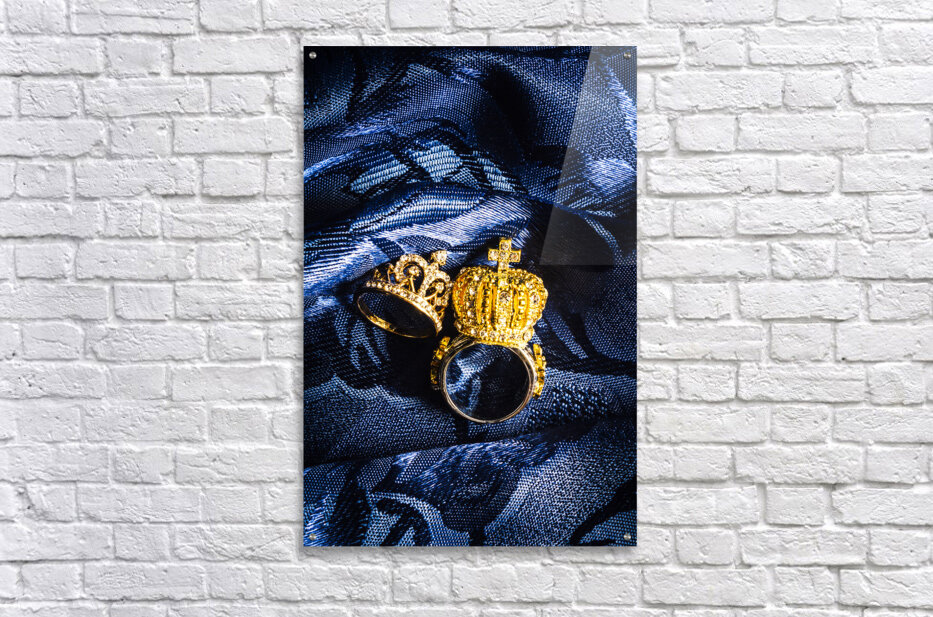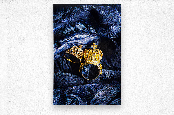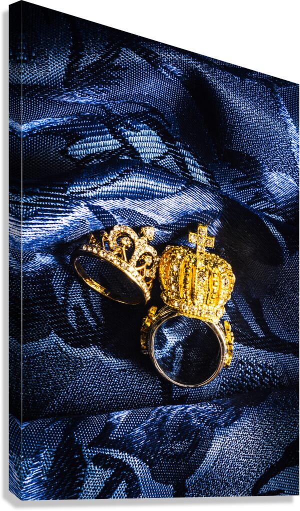 Two golden crown shape rings for royalty king and queen jewelery on royal blue background close-up power concept